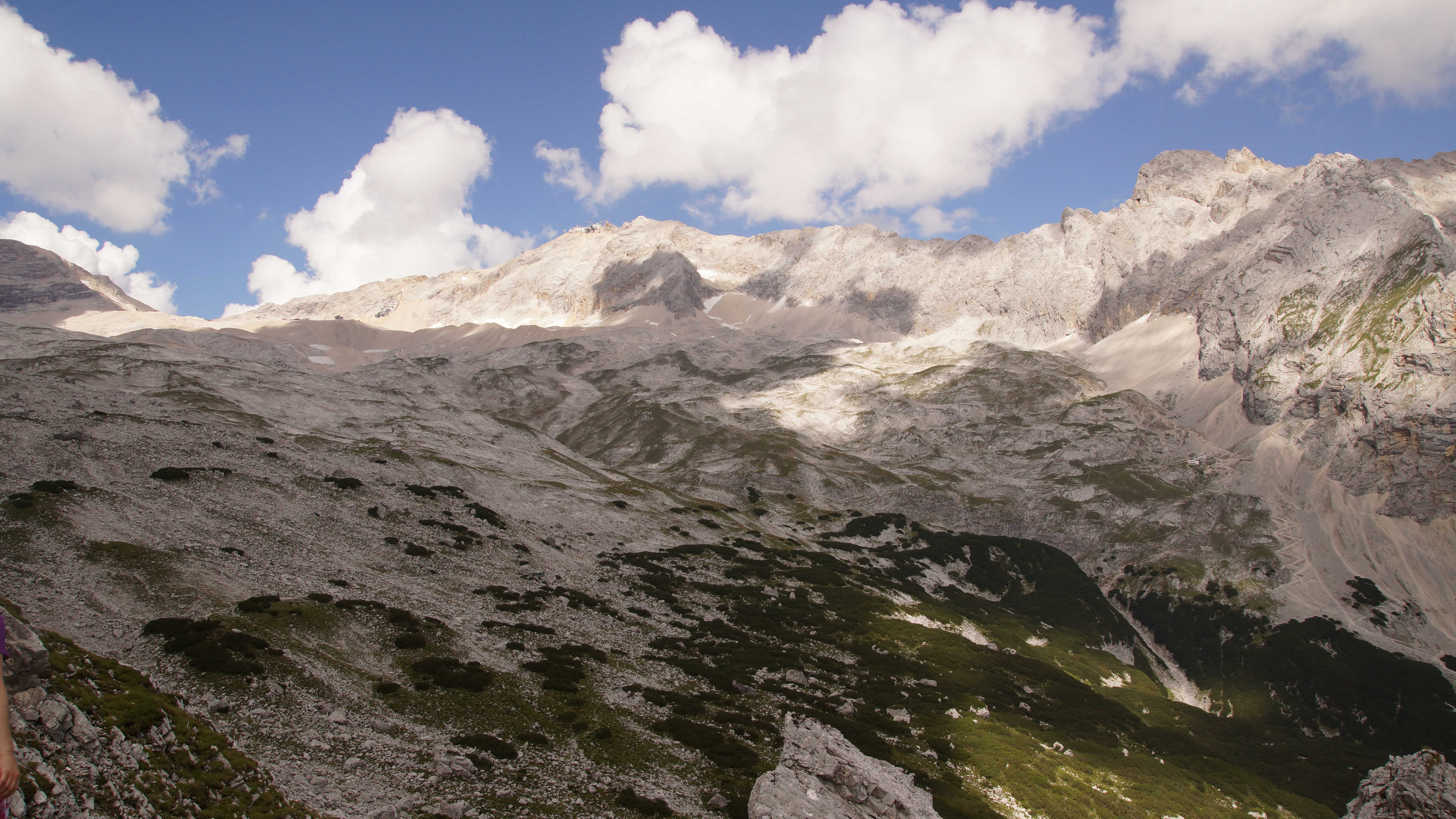 Die Höhe von deutlich über 2.000 m spürt man jetzt schon sehr. Man sieht hier durch die geschliffenen Felsen ganz deutlich wo früher einmal der Gletscher war. Heute ist auf dem Zugspitzplatt nur noch ein kläglicher Rest vom Gletscher übrig.