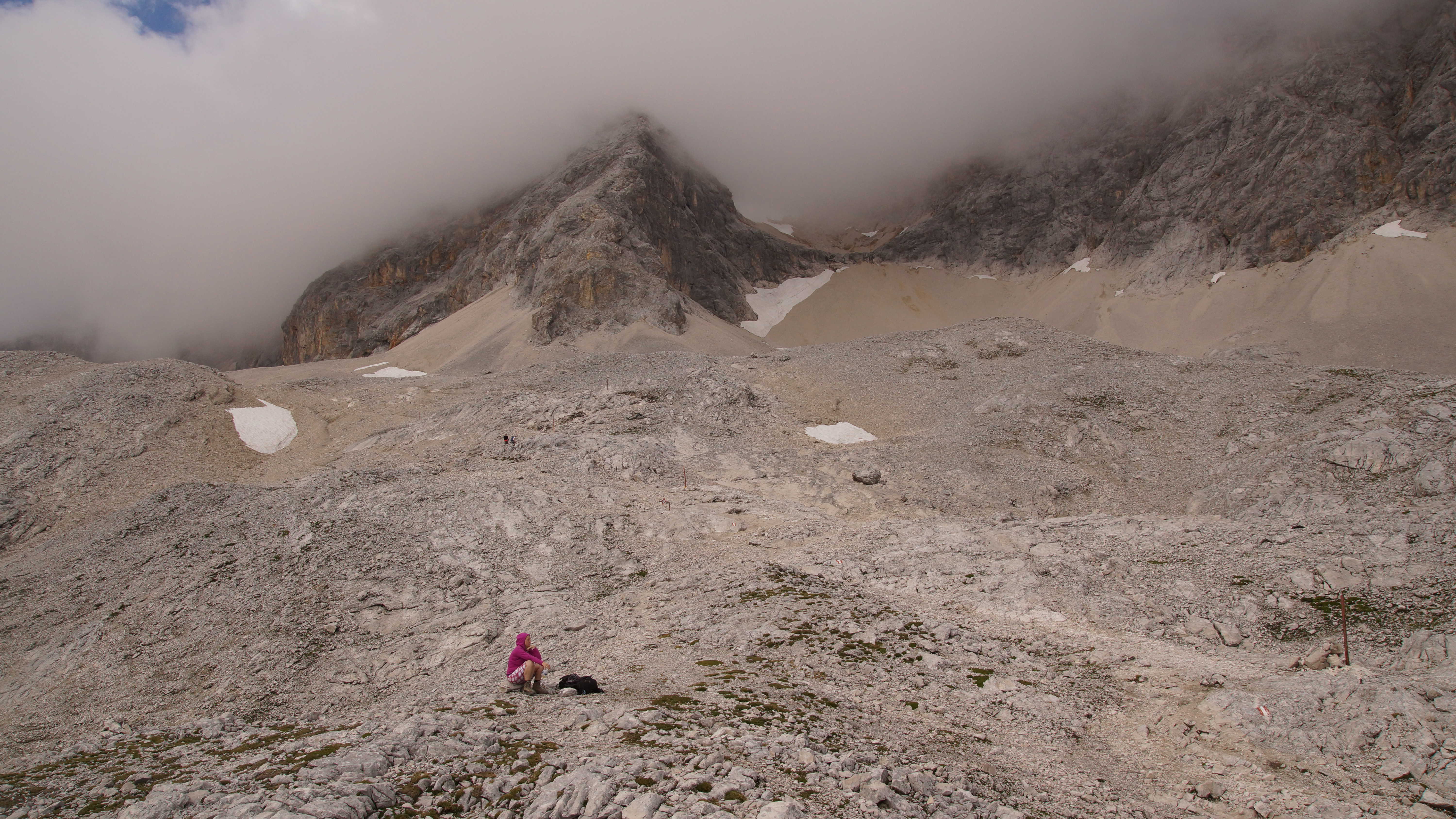 Nach knapp 30 Minuten Ruhepause sind wir zum letzten schweren Anstieg aufgebrochen. Der Anstieg ging ca. 1,5 Stunden teilweise sehr steil über eine Geröll- und Felslandschaft hinauf zum Zugspitzplatt (2.650 m).