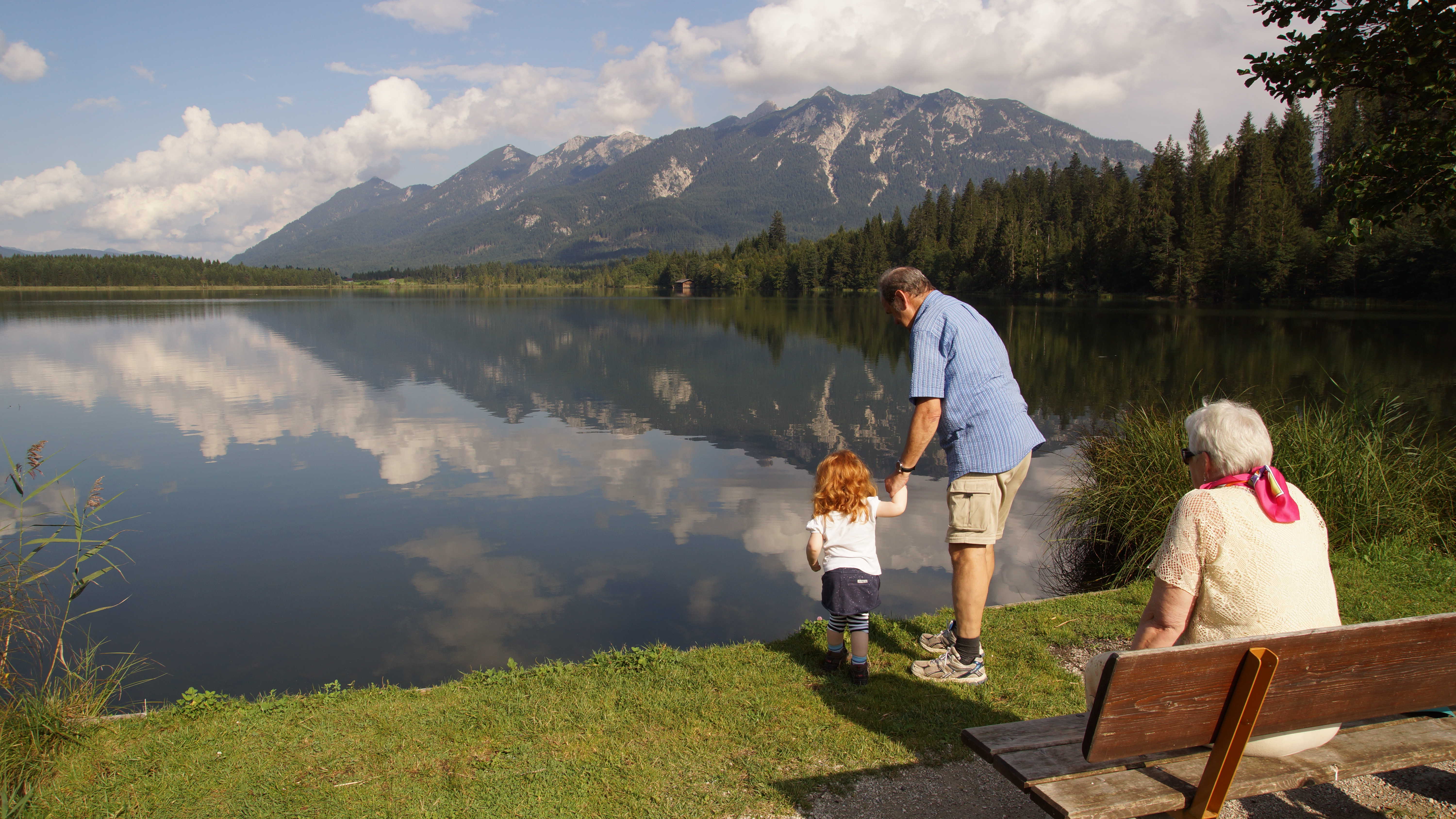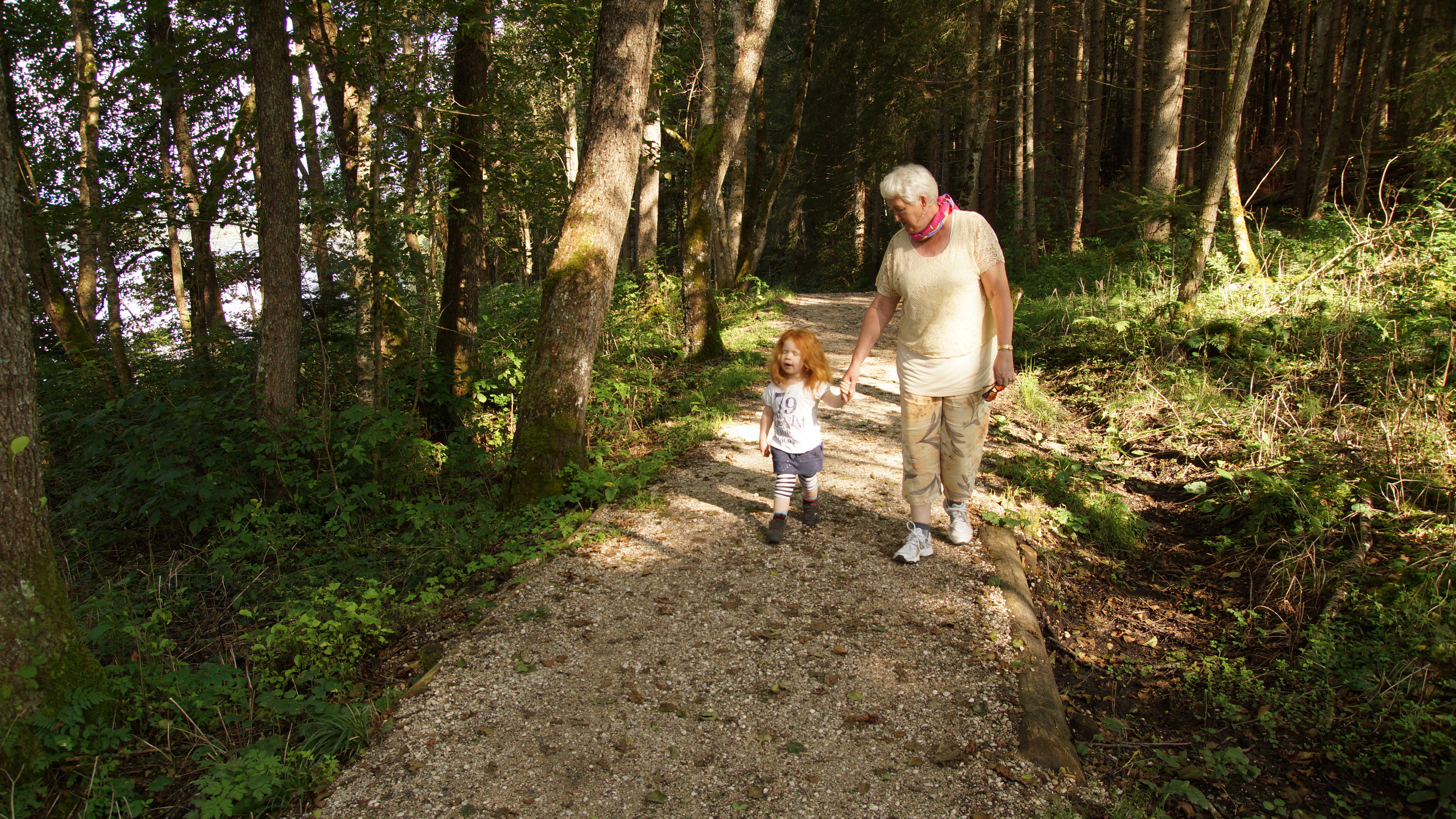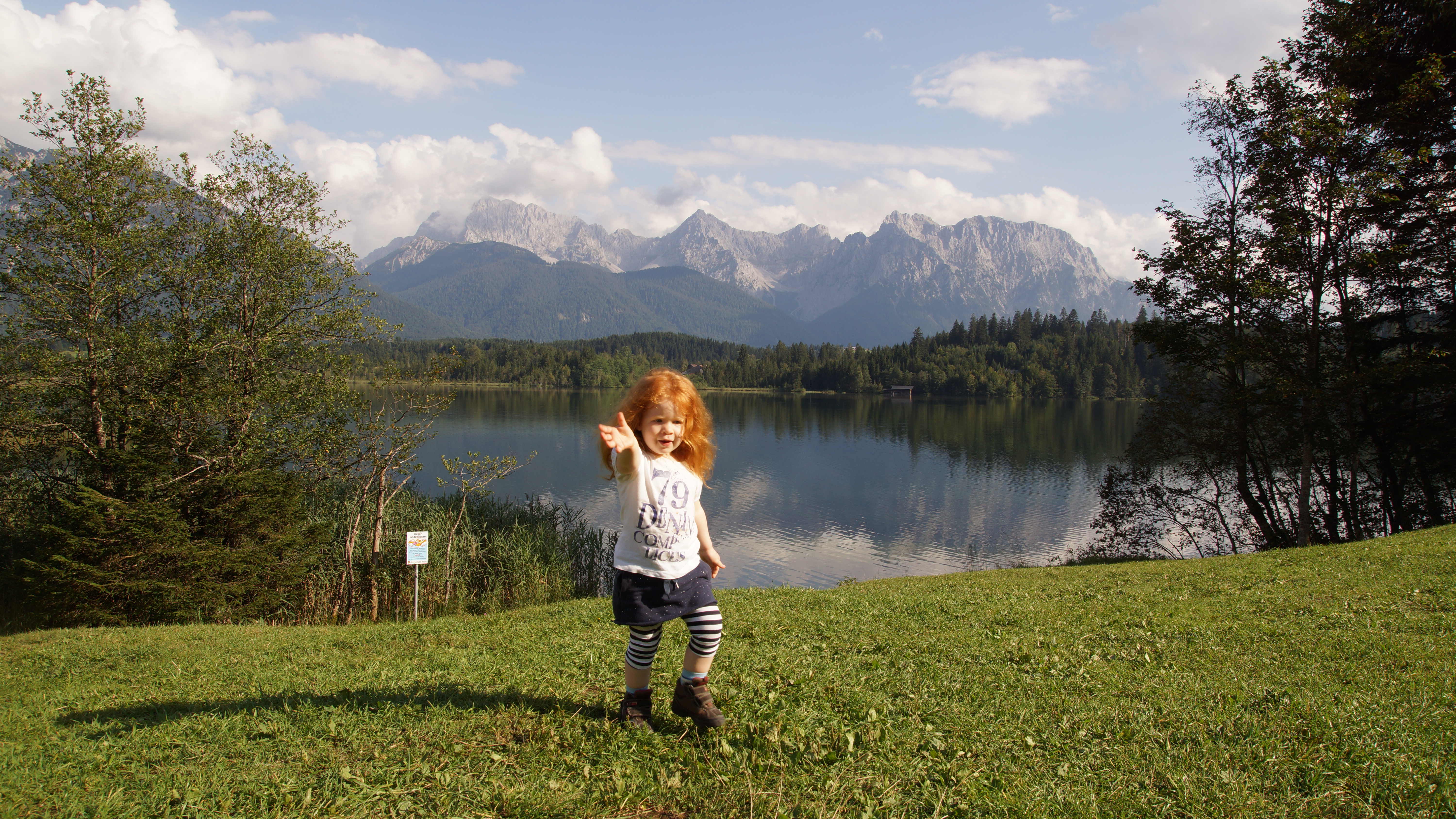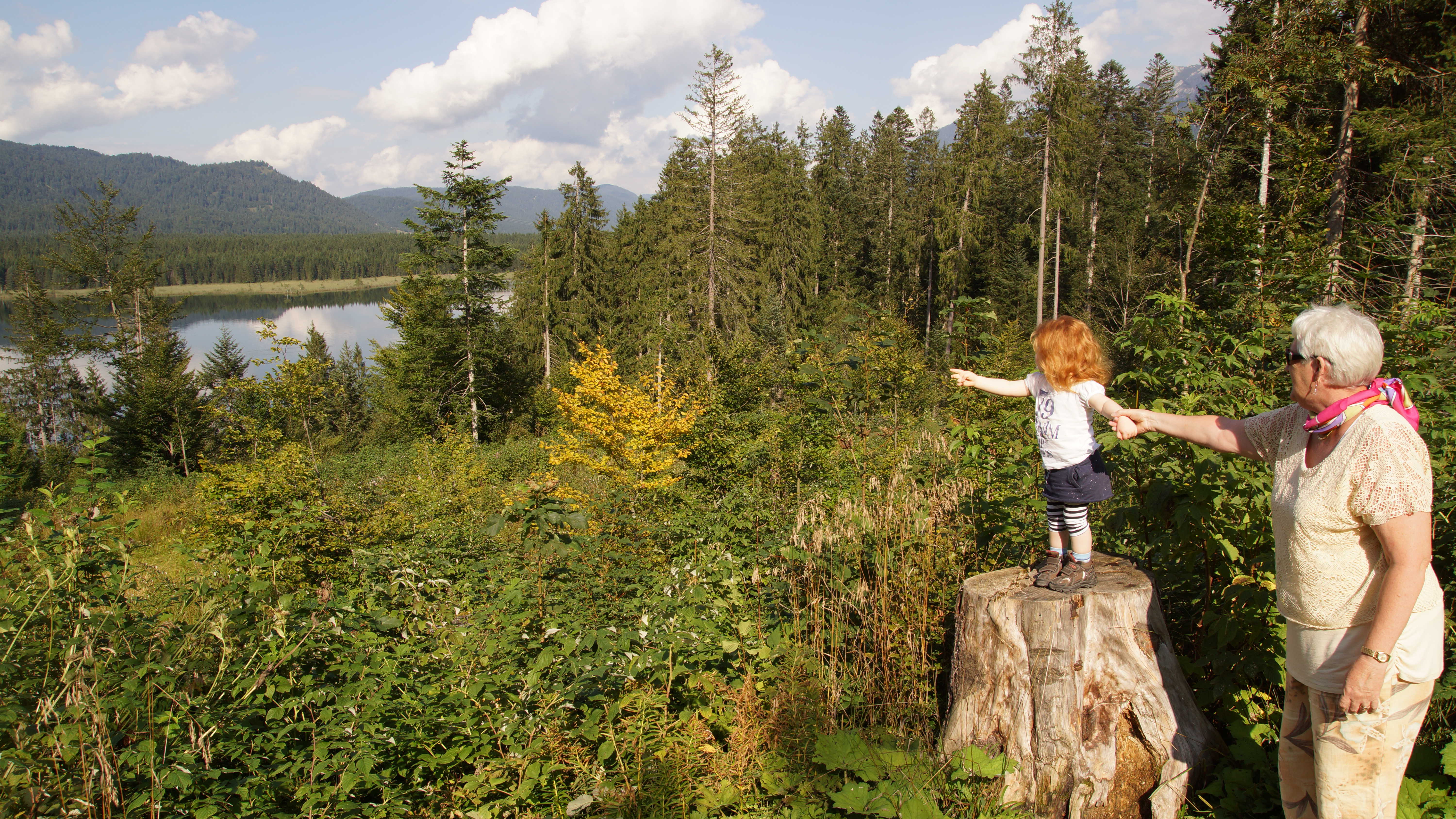 Der Barmsee ist der größte Alpensee hier in der Gegend. Amelie hat begeistert Steine ins Wasser geworfen und den See beobachtet. Der schöne Rundweg ging immer wieder durch urige Waldabschnitte und vorbei an kleinen Heuwiesen.