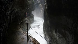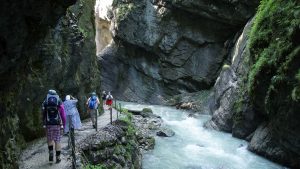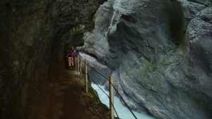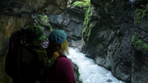 Die Partnachklamm bildete dann den grandiosen Auftakt unserer Wanderung zum Berggasthof Eckbauer. Der kleine in den Fels gesprengte Weg durch die Klamm war sehr schmal und führte immer wieder durch dunkle kleine Tunnel. Die Kinder haben wir daher auch in die Kiepen gesetzt. Finn war das am Anfang alles nicht so ganz geheuer aber nach einiger Zeit fand er es auch toll. Da wir letztes Jahr mit den Kindern durch die Leutascher Geisterklamm gelaufen sind, haben Amelie und Finn die ganze Zeit nach den Geistern gefragt und wo die denn hier in der Klamm schlafen würden.