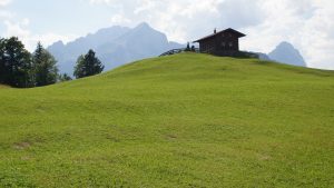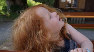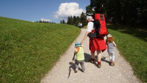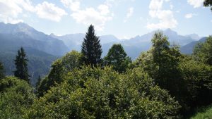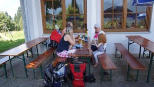 Nach einer kleinen Pause konnten sich die Kinder wieder in den Kiepen ausruhen und für den Rest hieß es nun sich zum finalen Anstieg auf den Eselberg zum Berggasthaus Eckbauer ca. 300 HM über schmale und steile Serpentinen den Wanderweg hinaufzukämpfen. Oben angekommen wurden wir mit einer tollen Aussicht auf das Wettersteinmassiv und auf die Zugspitze mit Alpsitz belohnt. Die Getränke und eine kleine Mahlzeit halfen schnell bei der Erholung von den Strapazen.