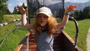 Für den Abstieg haben wir die faule aber für die Kinder aufregende Variante mit der Gondel gewählt. Die Gondeln hier sind schon sehr alt und es passen nur zwei Personen rein. Das Schöne dabei ist, dass diese offen sind und man so bei der Abfahrt die schöne Aussicht genießen kann.