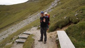 Nach dem wir in dem begehbaren Holzfernrohr (sieht tatsächlich nur so aus wie ein Fernrohr, ist aber natürlich keins) den grandiosen Blick auf Mittenwald, Krün und Wallgau bestaunt hatten, sind wir mit den Kindern in den Kiepen noch den kleinen Rundweg gelaufen. Da der Wind wirklich sehr ungemütlich war und auch die Wolken die Ausblicke etwas einschränkten, sind wir auch direkt nach dem Rundgang wieder ins Tal gefahren.