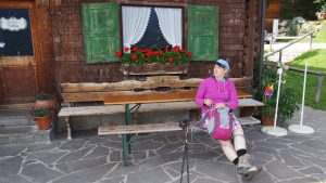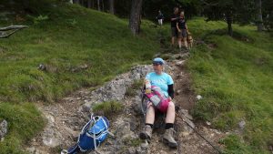 Danach ging der Weg über steile Serpentinen zunächst durch Latschenkiefergelände, dann durch den Wald bergab zur Martinshütte, die aber heute Ruhetag hatte. Also sind wir schnell die letzten 200 HM auf einer Forststraße zurück zum Berggasthof Almhütte gegangen, wo wir uns alle mit einem erfrischenden Radler belohnt haben.