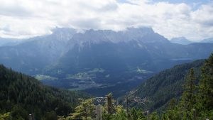 Vom Parkplatz aus ging unser Wanderweg direkt mit einer ordentlichen Steigung hinauf Richtung Stepbergalm. Der Weg führte uns zunächst durch lichten Bergwald und wir konnten immer wieder durch die Bäume auf das Wetterseingebirge mit der Alpspitz und der Zugspitze blicken. Leider lag die Zugspitze die gesamte Wanderung in den Wolken, was den überwältigenden Blicken aber nur wenig schadete. Nach ca. 2 Stunden mit teilweise giftigen Anstiegen über die ersten 800 HM erreichten wir die Stepbergalm, wo wir uns von den ersten Anstrengungen erholen konnten. Zudem wurden wir mit einem tollen Blick auf das Wettersteingebirge belohnt.
