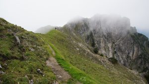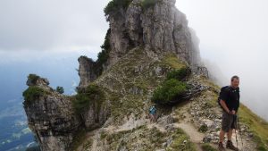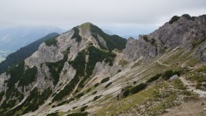Von der Stepbergalm führte uns der Weg sehr steil die nächsten Höhenmeter durch eine Latschenkieferzone hinauf. Nach diesem Anstieg führte uns der Weg etwas flacher zunächst an der Bergseite und zum Schluss wieder steiler in erodiertem Gelände entlang des Rückens auf den Kramerspitzgipfel. Die Aussichten auf Garmisch-Partenkirchen und das Wettersteingebirge auf der einen Seite, das Karwendelgebirge Richtung Osten und die Ammergauer Alpen im Norden sind sensationell. Leider zogen von Norden her Wolken auf, so dass wir schnell den Abstieg über den Kramersteig in Angriff genommen haben. Der wirklich tolle Steig verlief über Schrofengelände, querte zu einem Bergsattel, wo man wieder ein Stück aufsteigen musste, um dem Gratverlauf zur Mittergernspitze zu folgen, was nach dem 1.200 HM Aufstieg noch mal richtig anstregend war.