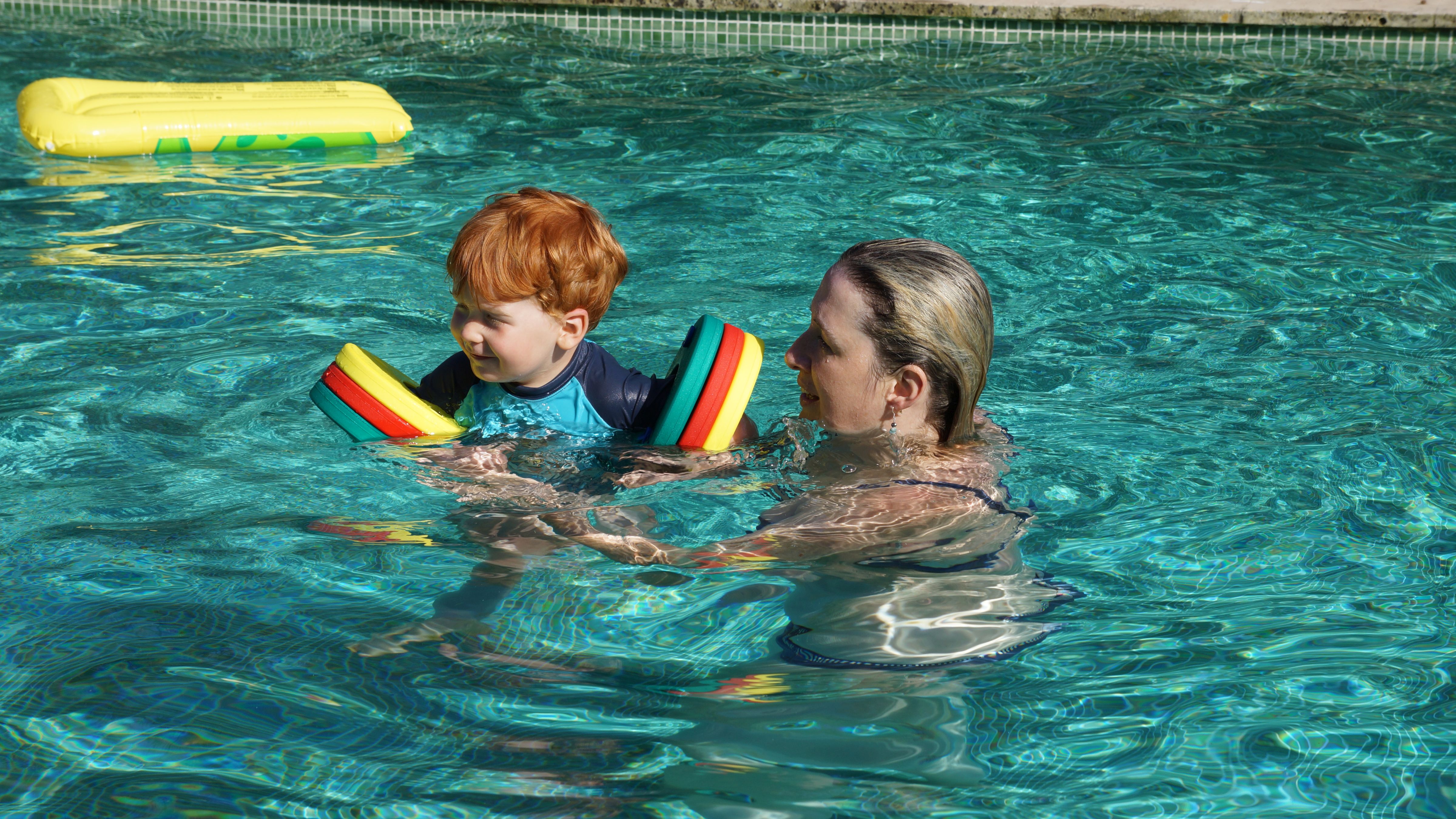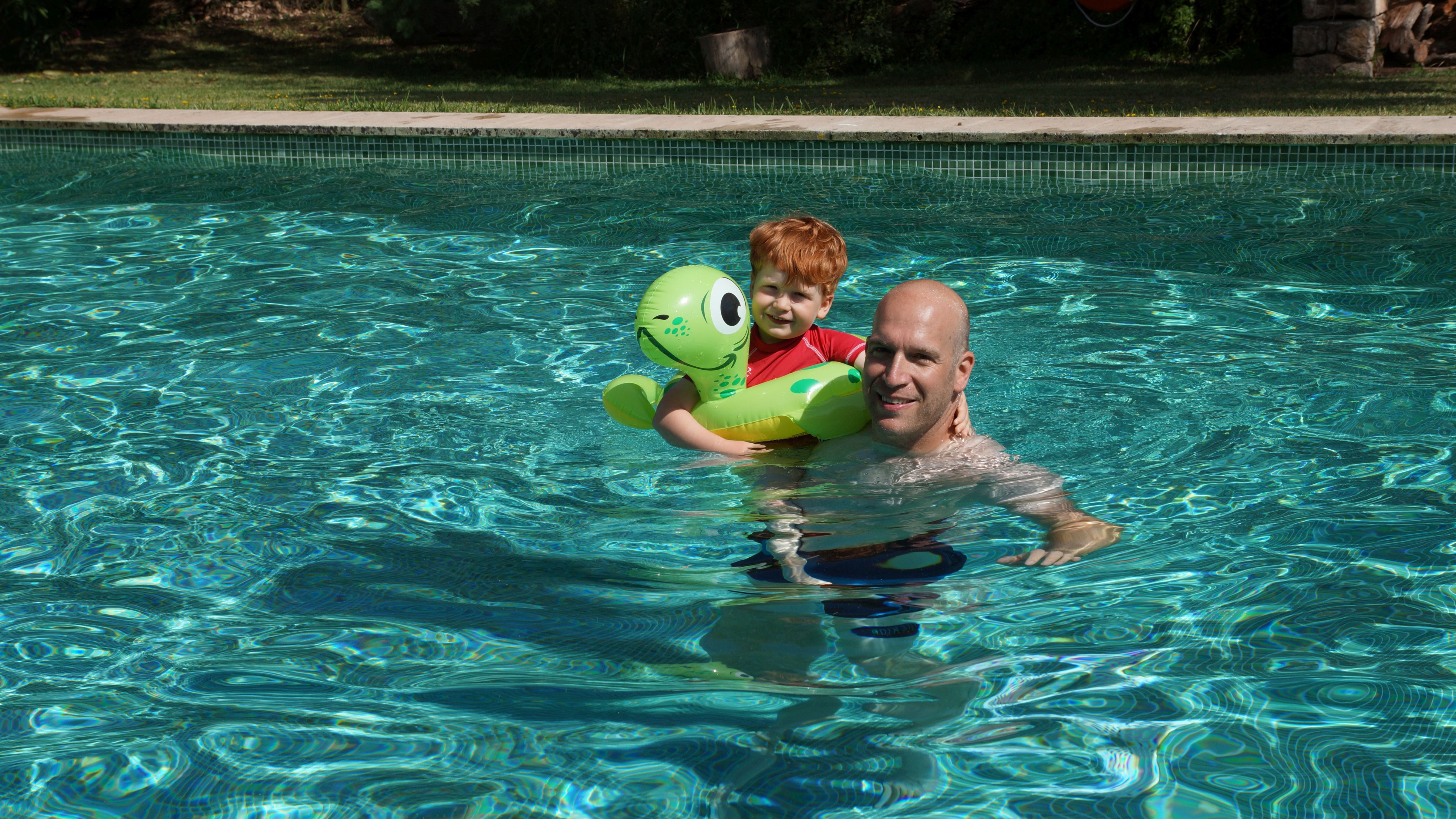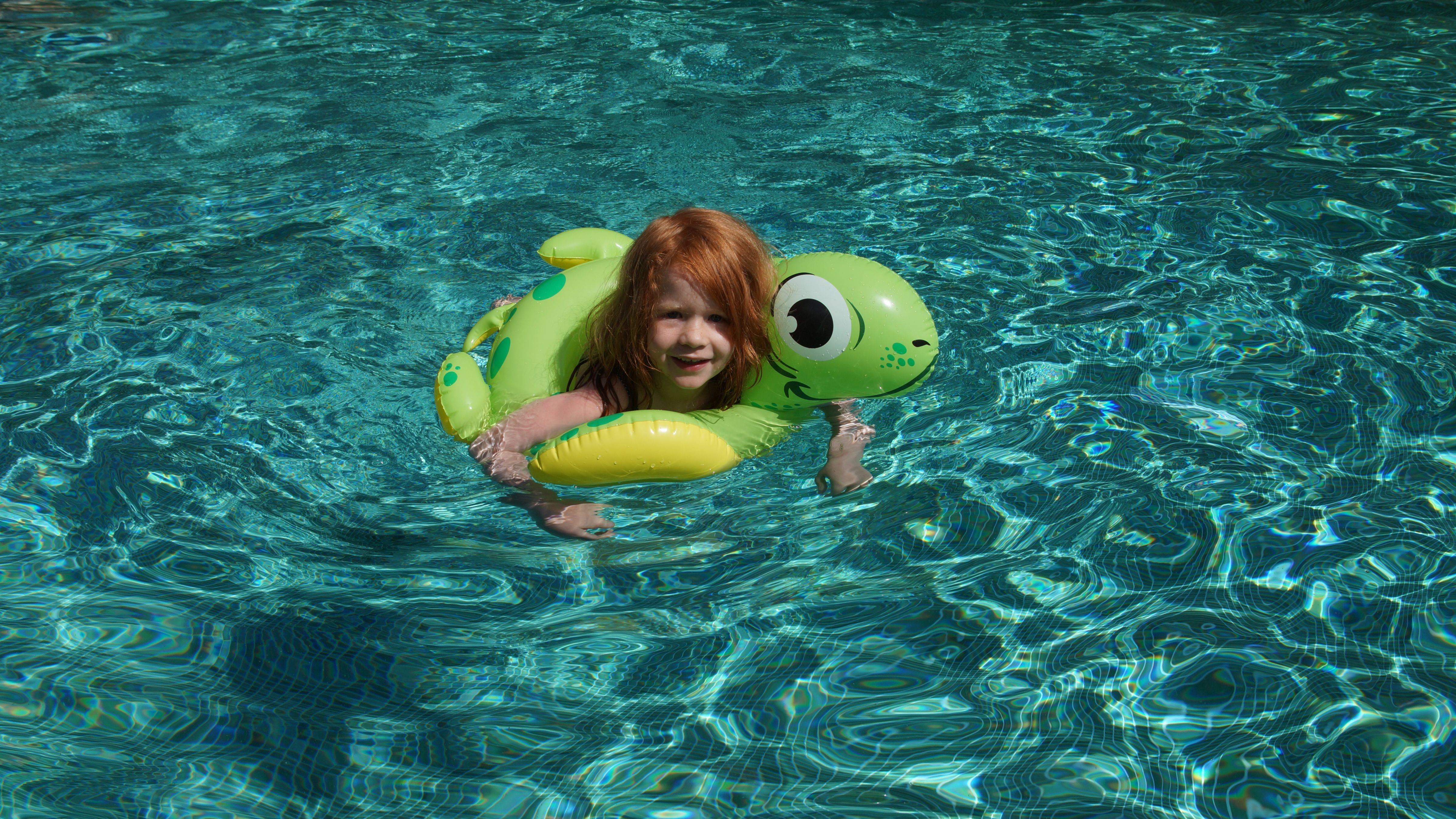 Danach haben wir den Nachmittag in der Sonne an unserem Pool genossen. Amelie und Finn trauen sich langsam immer mehr zu und waren heute zum ersten Mal mit ihren Schwimmflügelchen im Wasser.