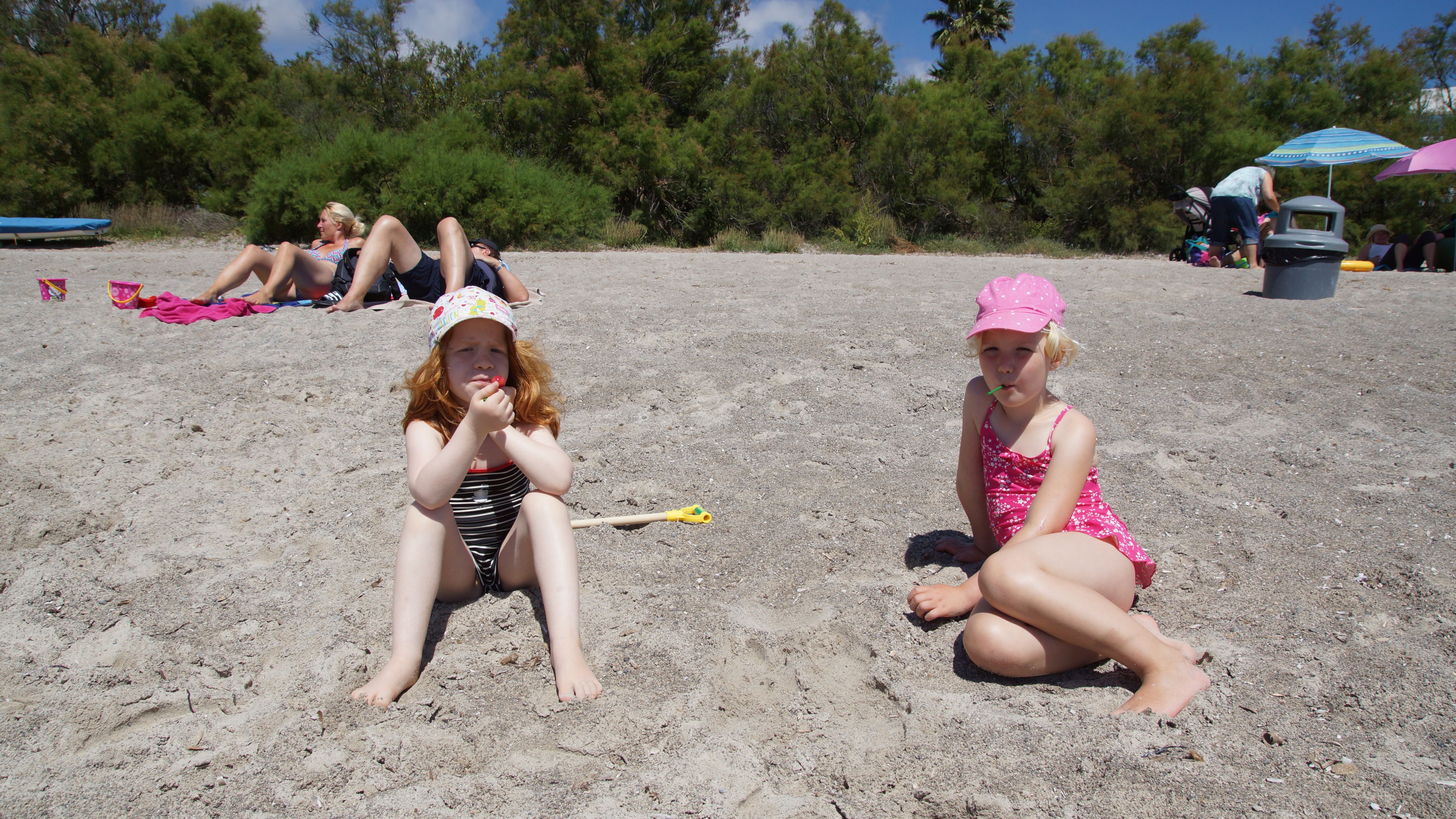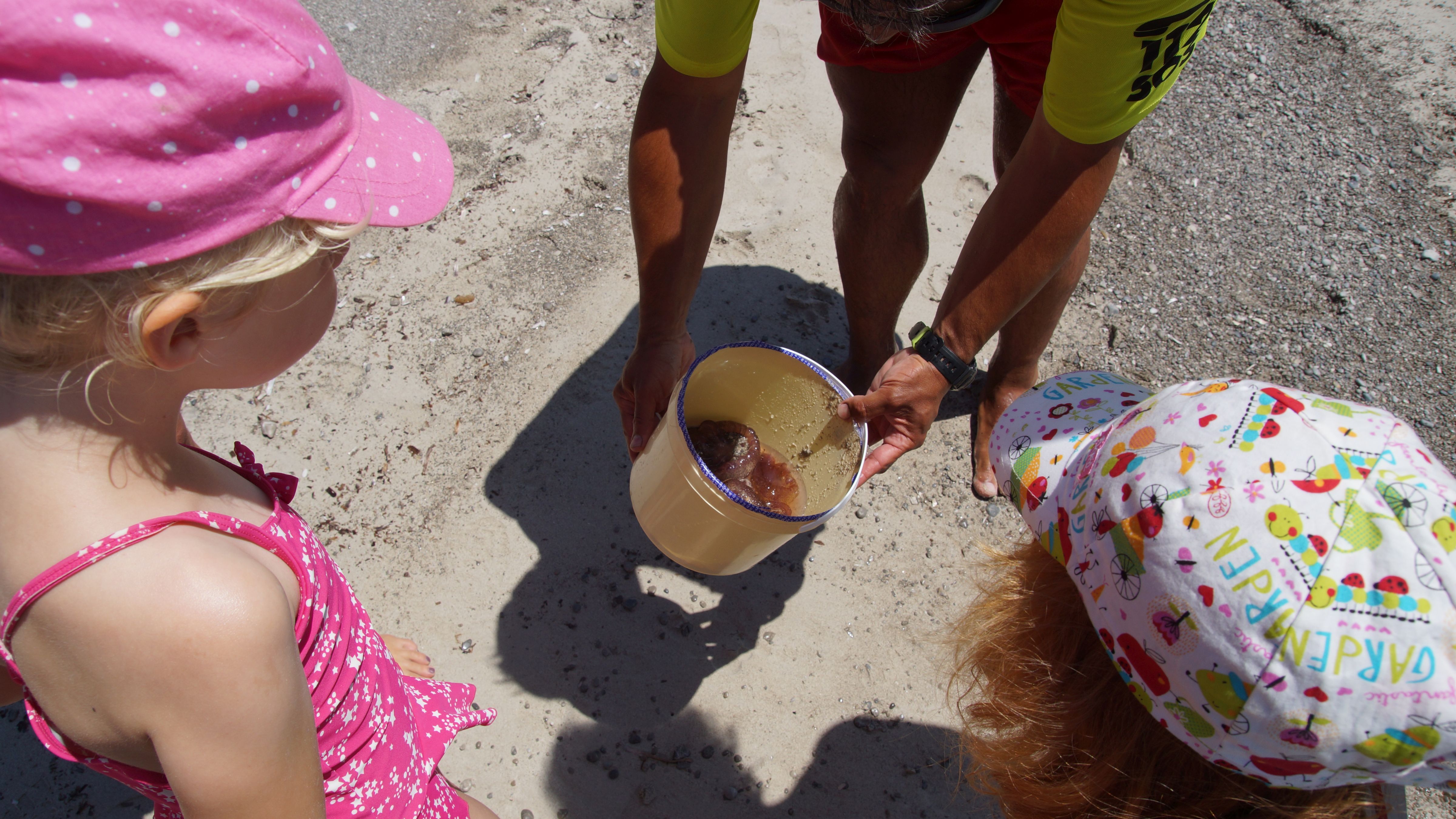 Leider wurde uns das Baden im Mittelmeer etwas vermiest, da die Rettungsschwimmer Feuerquallen aus dem Meer gefischt haben, die wir auch im Eimer bewundern durften.