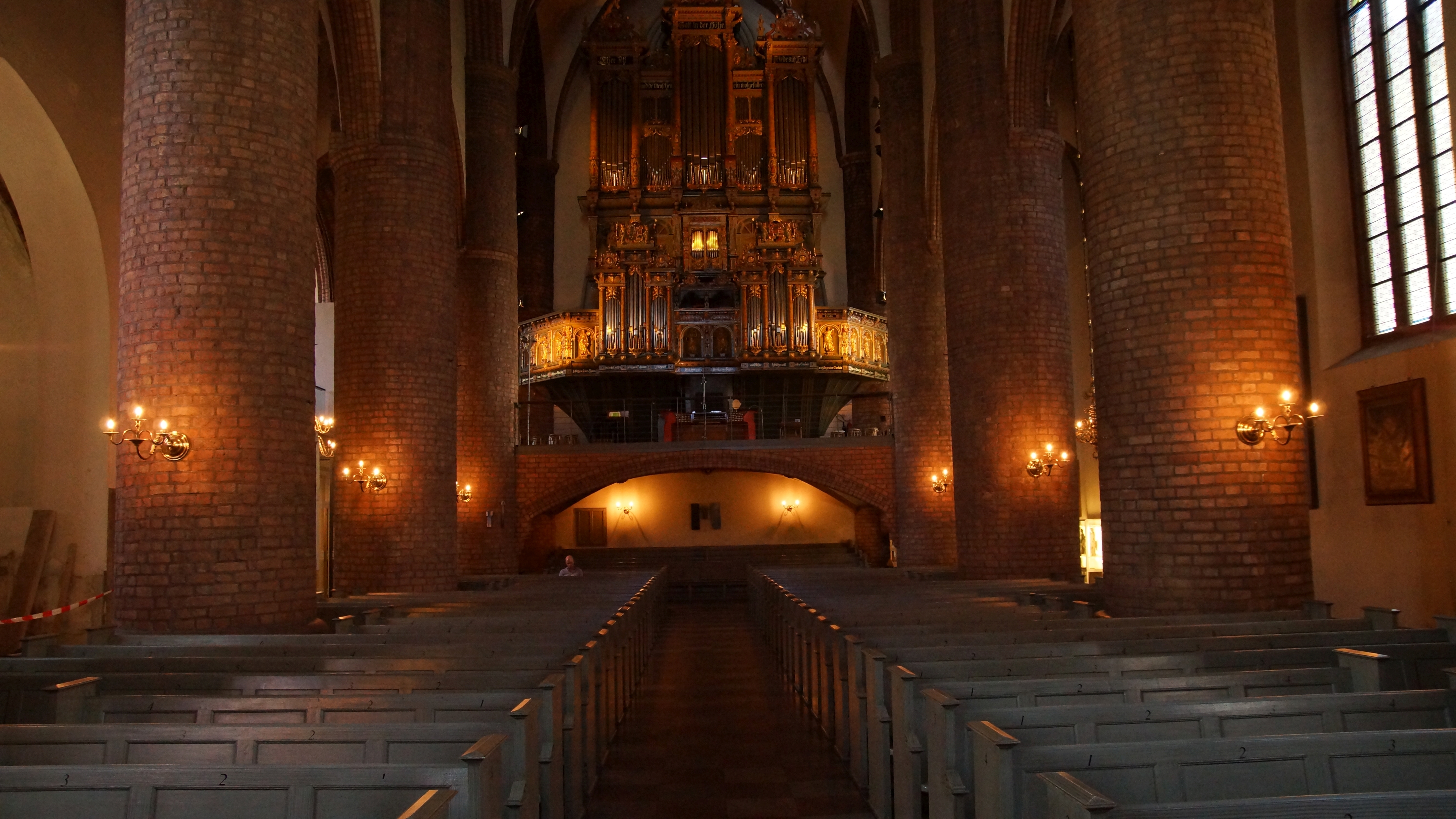 Nach dieser kleinen Stärkung konnten wir dann unser Hotelzimmer beziehen. Kurz darauf hat uns dann Anja, eine Volleyballfreundin von Sandra abgeholt, die nun schon seit 4 Jahren in Flensburg wohnt. Mit Anja hatten wir dann zusammen eine tolle Stadtführung mit der ersten Station St. Nikolaikirche. Die Kirche ist im Besitz einer beeindruckenden Orgel.