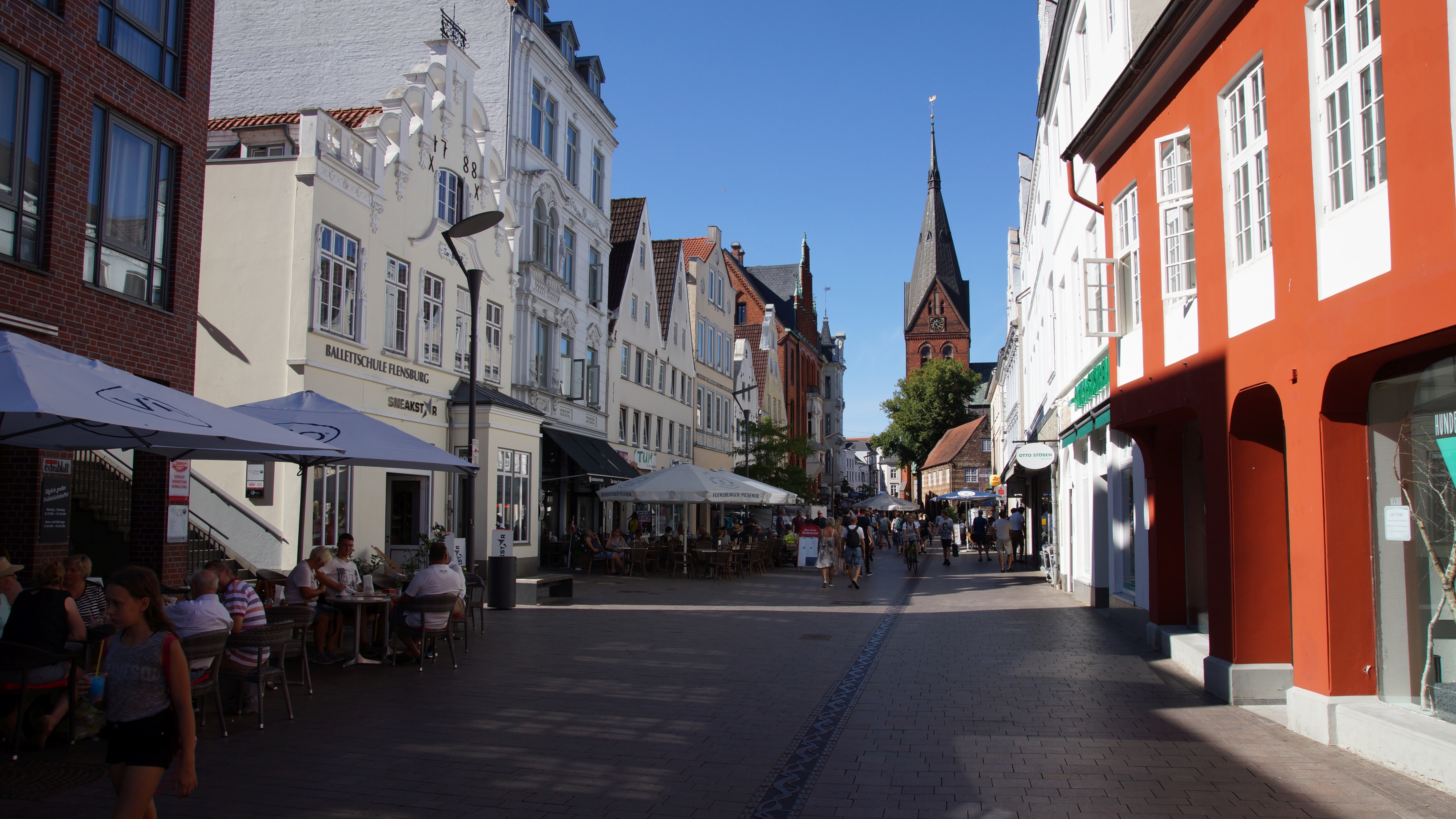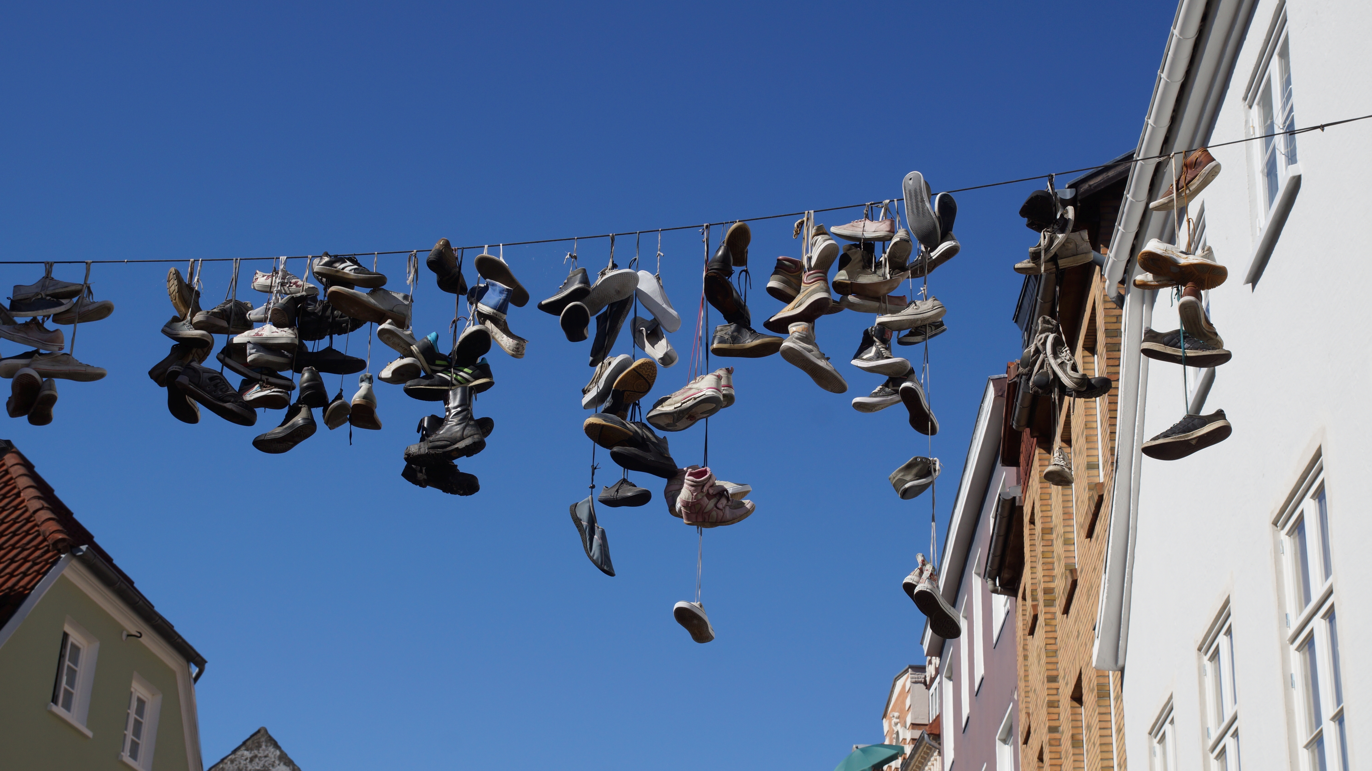 Die Innenstadt ist geprägt von den niedlich restaurierten alten Seemanns- bzw. Handelshäusern, in denen nun alle möglichen Geschäfte zu Hause sind. Die Einkaufsstraße mündet in die Norderstraße, die mit einem lustigen Ritual aufwartet. Über der Straße sind Seile von einer Hausseite auf die andere gespannt über die die Leute ihre alten Schuhe schmeißen. Das sieht ziemlich witzig aus.