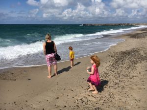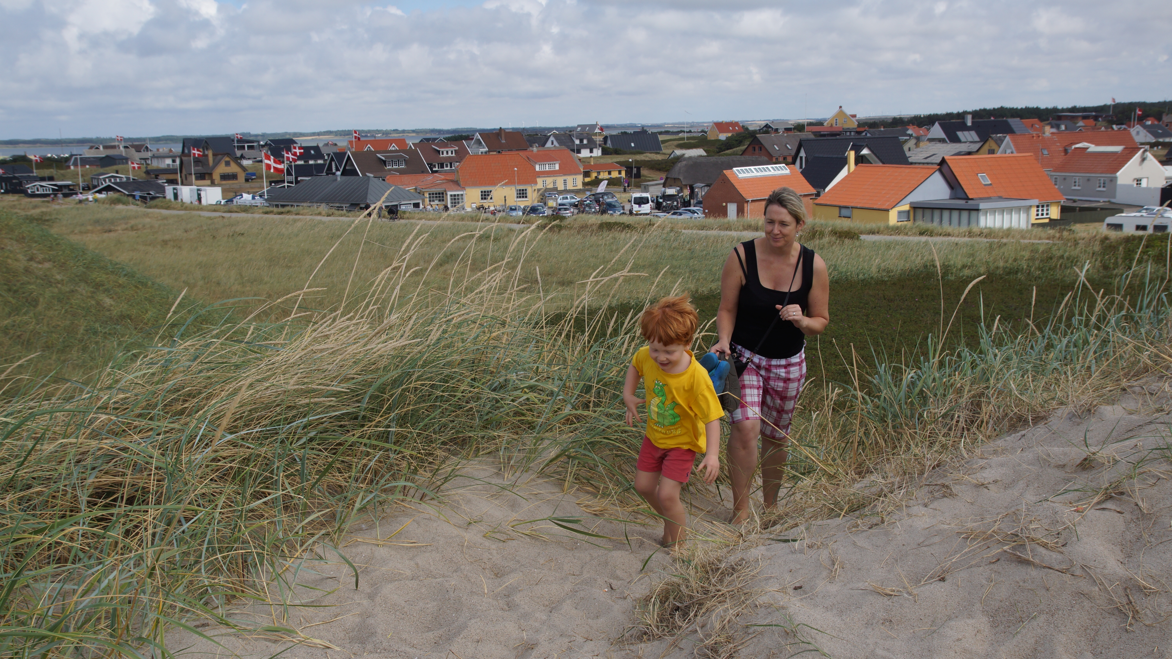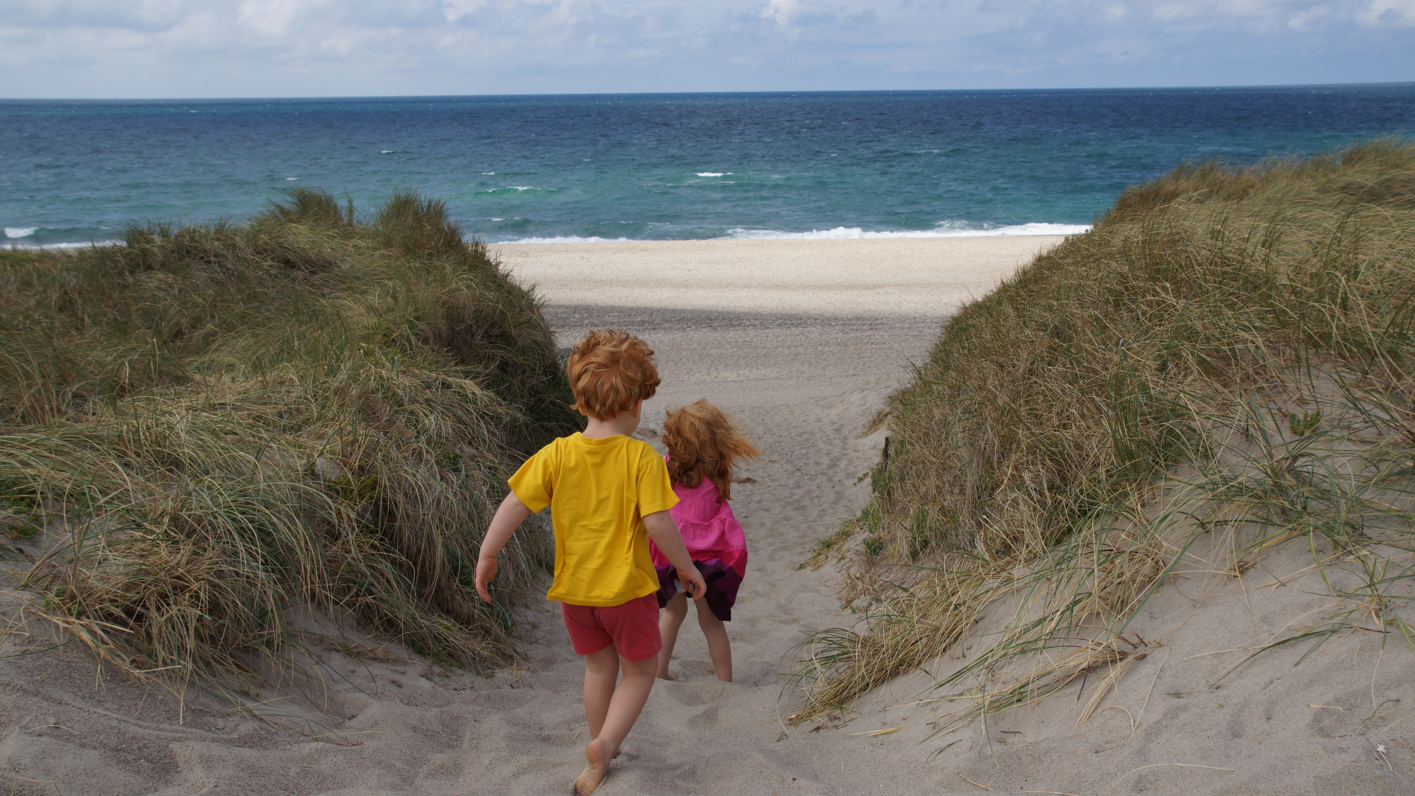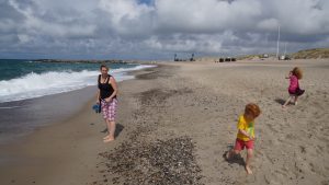 Natürlich waren wir um gegen 14 Uhr viel zu früh für die Schlüsselübergabe in Krik, weshalb wir auch erstmal in den Nachbarort Agger direkt an die Nordseeküste gefahren sind. Hier sind wir dann auch sofort über die Dünen zum offenen Meer gelaufen und habe uns den Wind um die Ohren pfeifen lassen. Die Kinder haben natürlich sofort sämtliche greifbaren Steine ins Meer geworfen. Allerdings muss man hier schon etwas mehr aufpassen als auf Mallorca, da die Wellen hier doch deutlich größer sind.