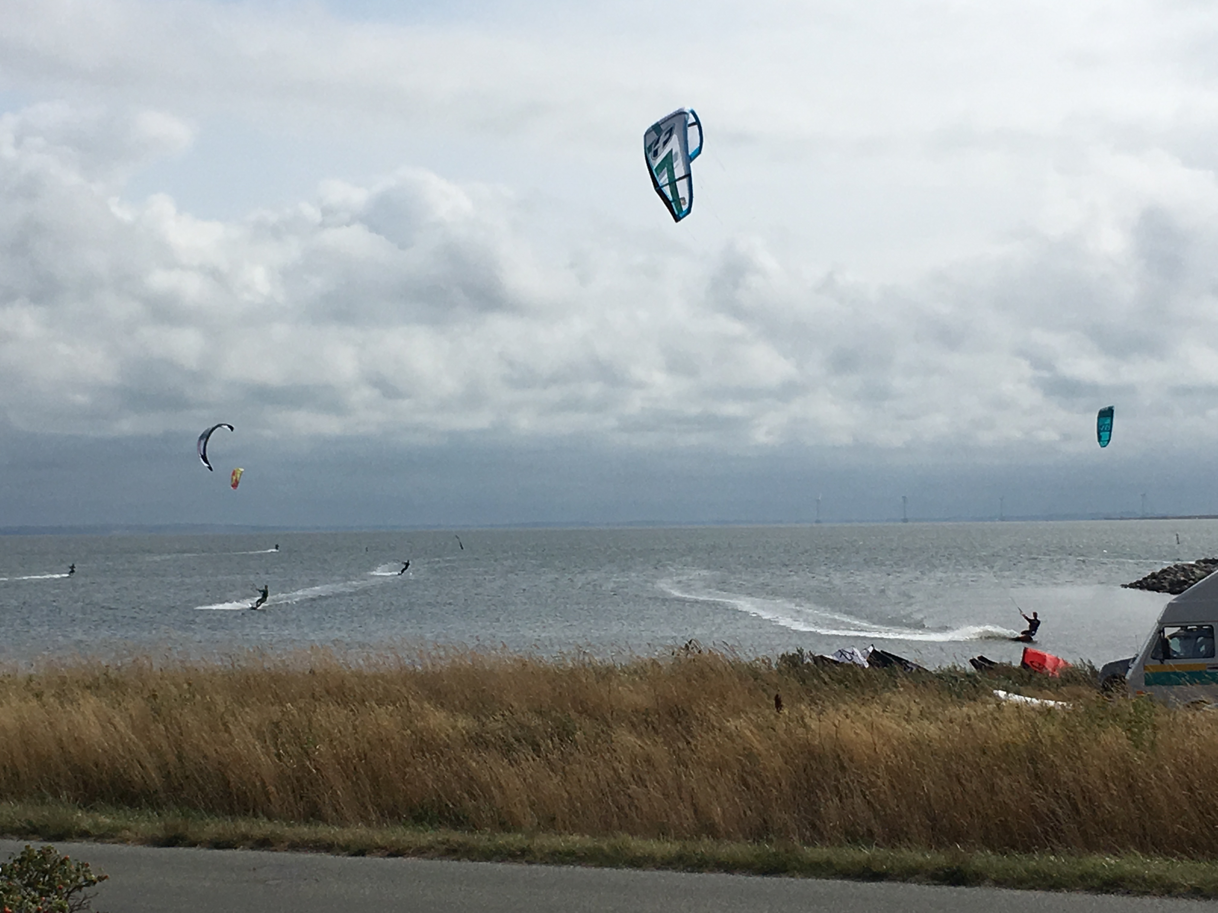 Nach dem Autoauspacken und dem ersten Einrichten haben wir dann alle zusammen Nudeln mit Tomatensoße gekocht. Das Wetter ist hier zur Zeit sehr windig und wechselhaft. Während die Kinder sich bettfertig gemacht haben, bin ich noch einmal zu Strand, um mir im Wind die letzten Surfer anzuschauen, die noch draußen auf dem Wasser waren.