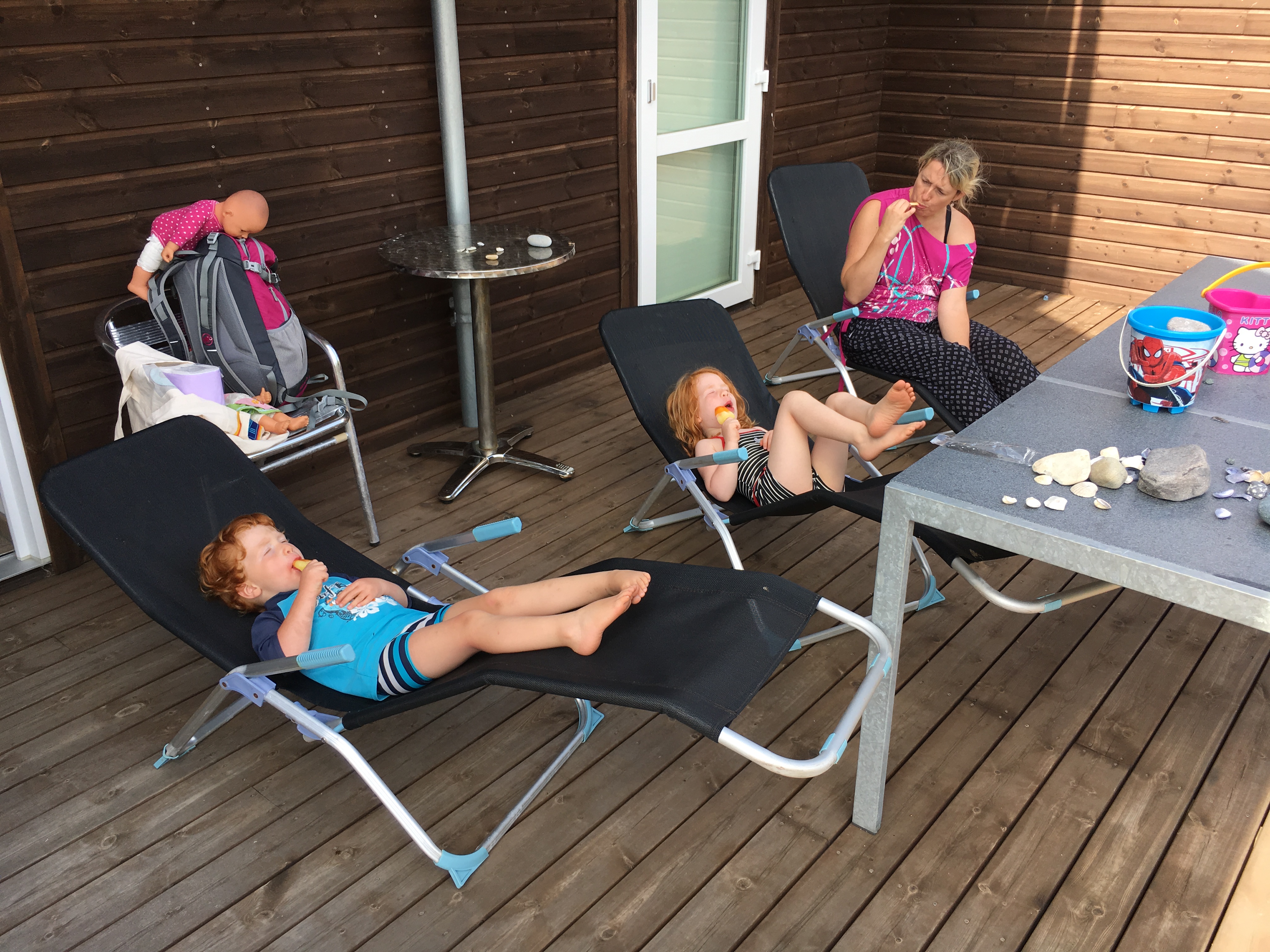 Nach den Abkühlungen im Meer haben die Kinder wieder ausgiebig Steine gesammelt oder die Sandburg weitergebaut. Aber irgendwann hieß es dann zusammenpacken. Wir hatten einen herrlichen Tag am Strand und zur Stärkung gab es für alle auf unserer Terrasse ein leckeres Eis bevor wir uns in unserer großen Badewanne vom übrig gebliebenen Sand entledigen konnten.