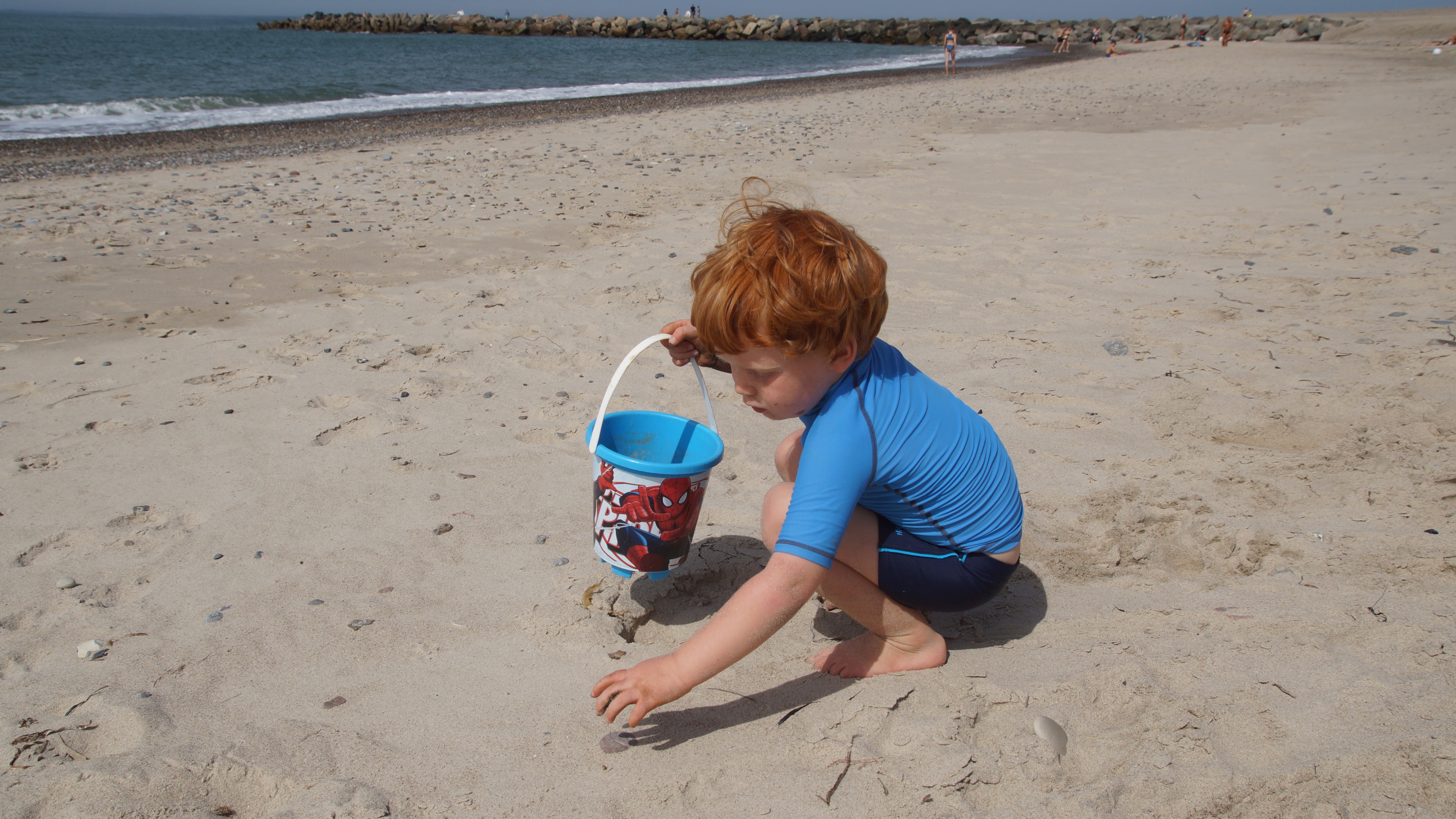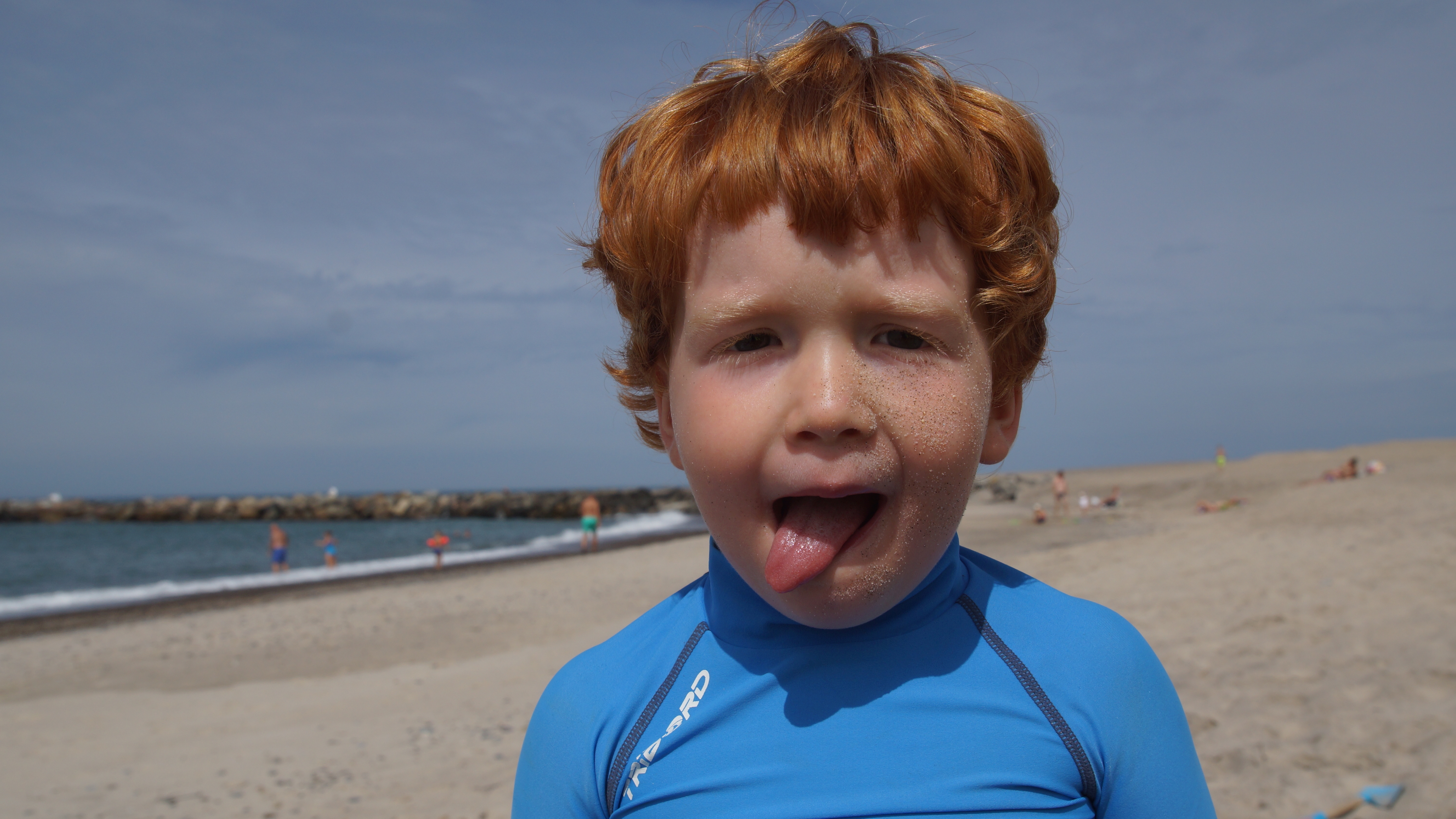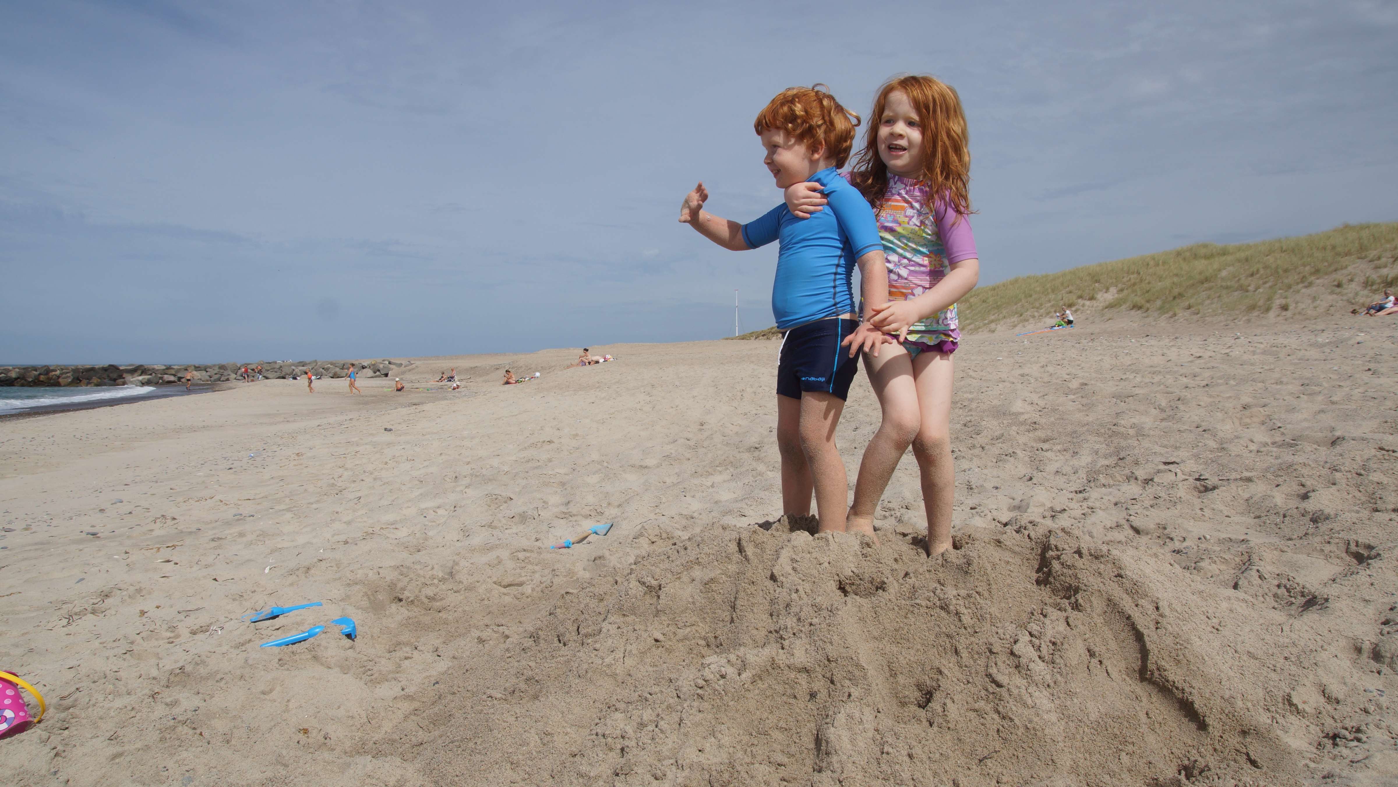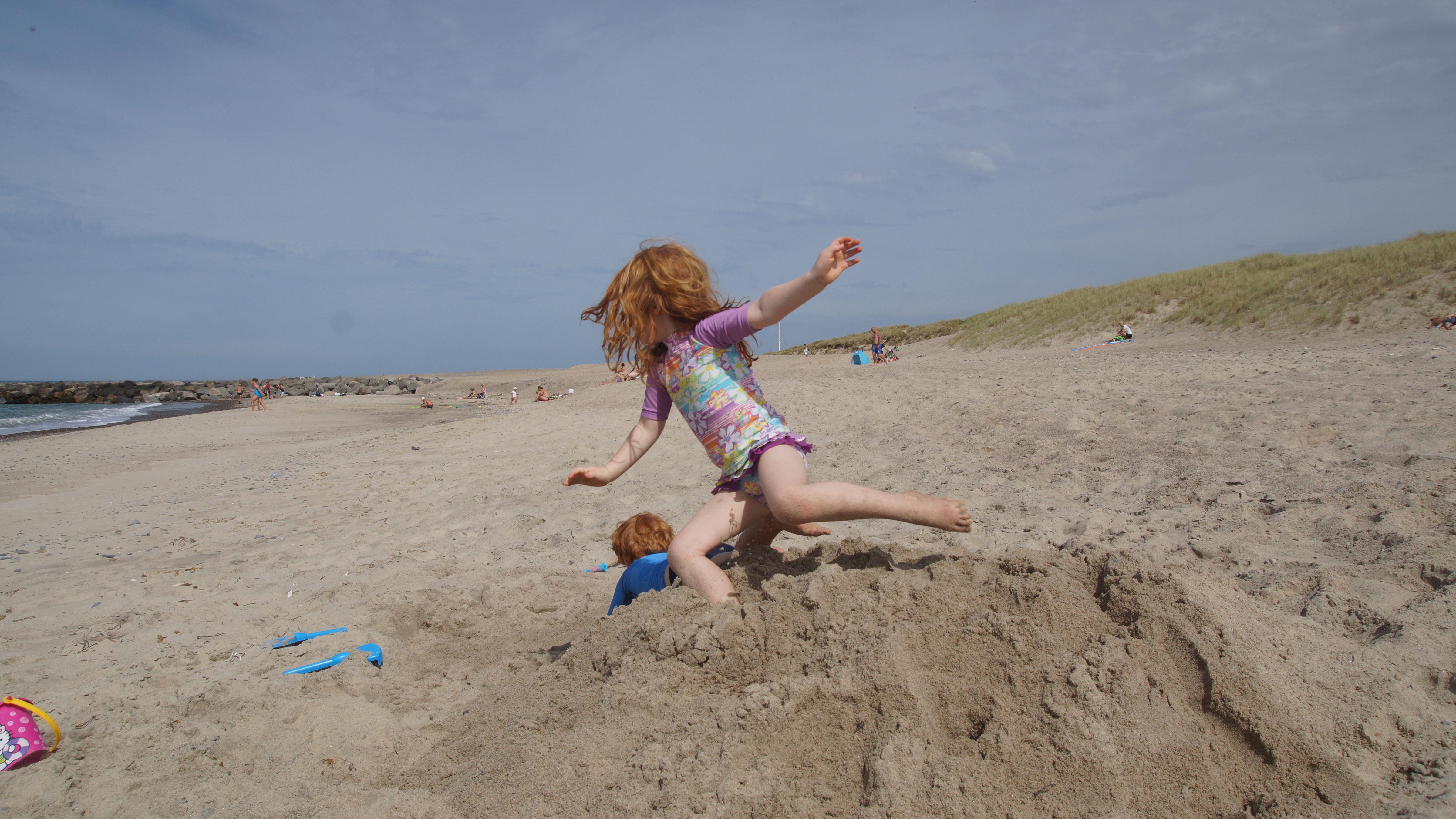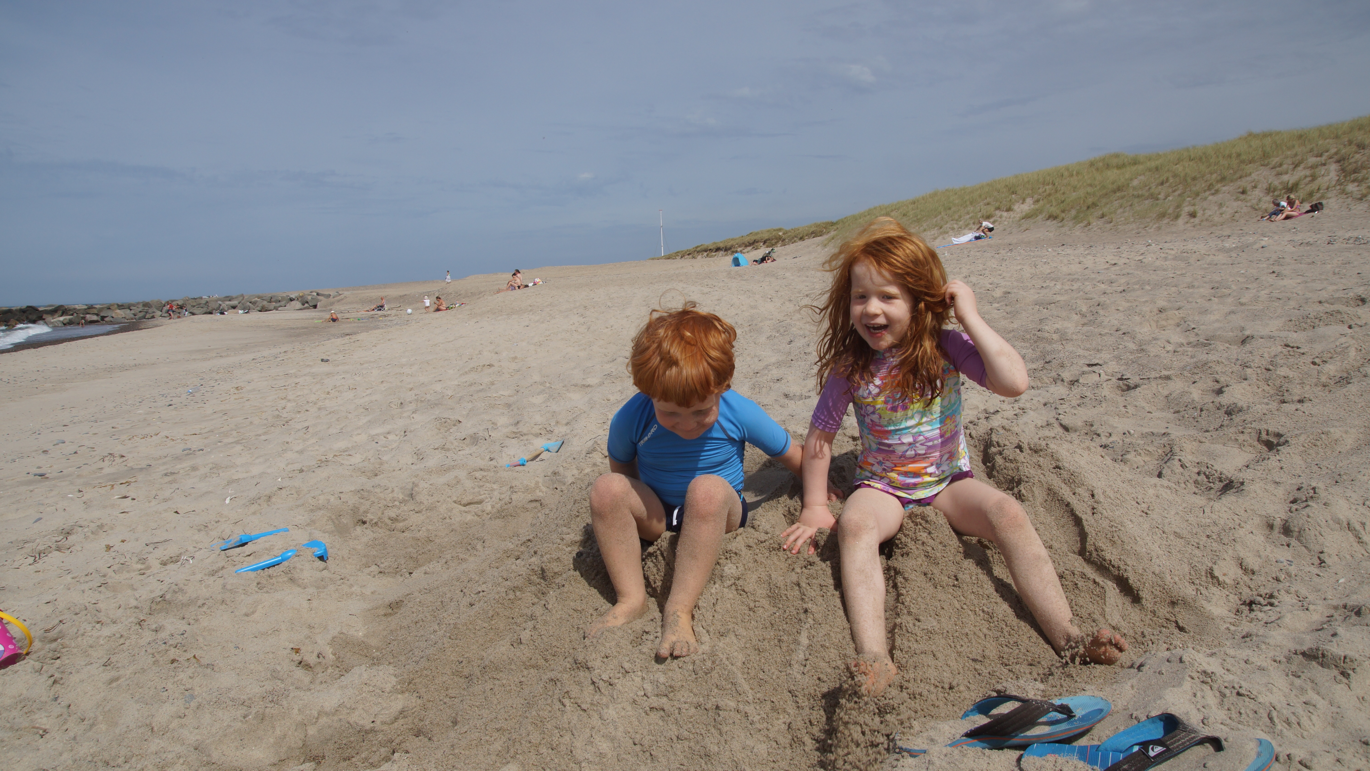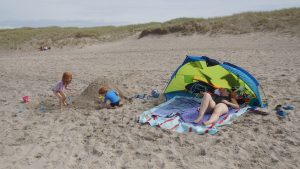 Nach dem leckeren Frühstück hieß es dann endlich für alle Badehosen und Badeanzüge anziehen und ab nach Agger zum Strand. Am endlosen Sandstrand verteilten sich die wenigen Strandgänger so gut, dass man völlig ungestört einen Platz für sich hatte. Hauptsächlich ein paar wenige weitere Familien mit Kindern tummelten sich ab und an in unserer Nähe. Aber ein wenig Leben am Strand ist ja auch schön.