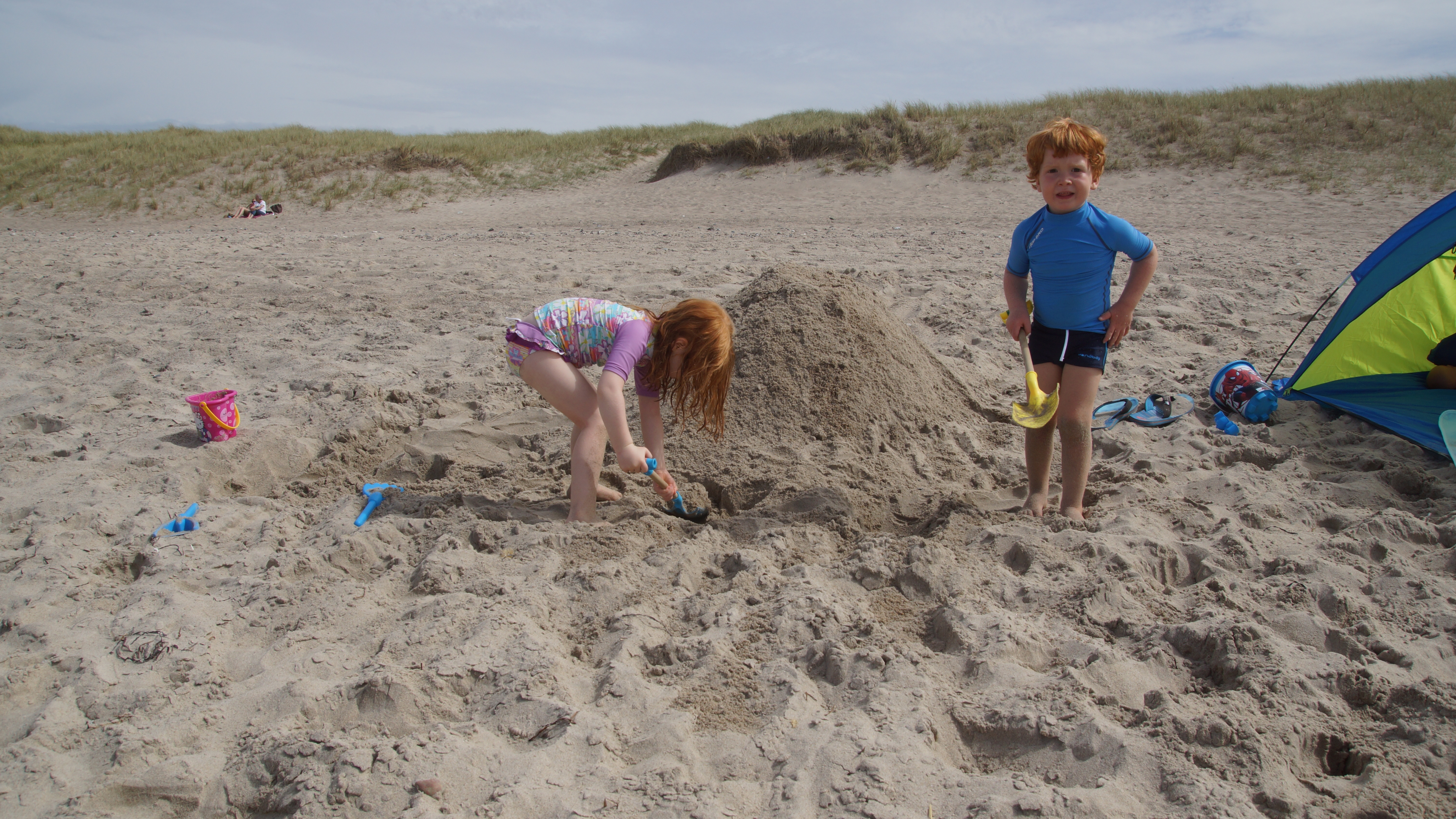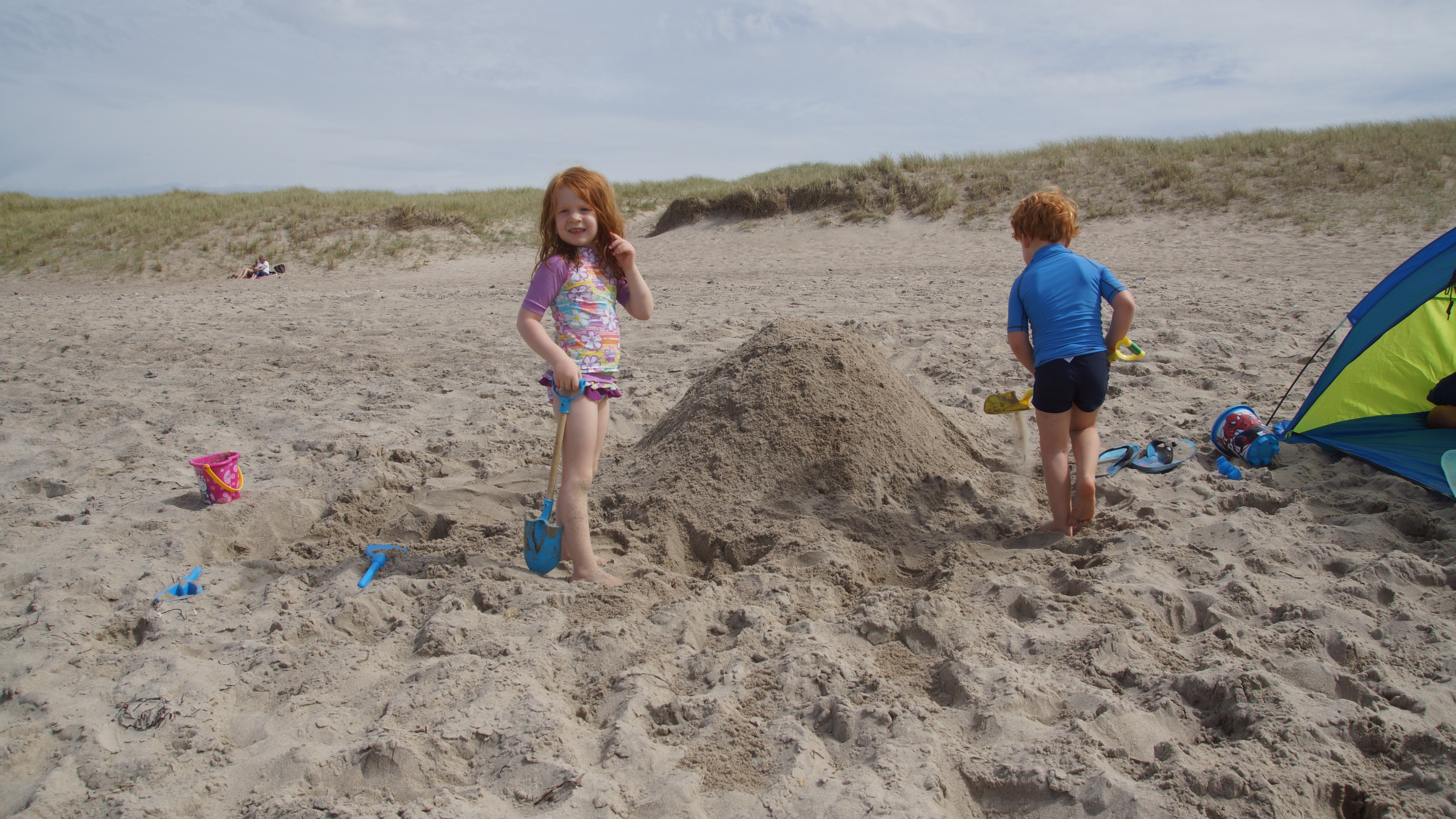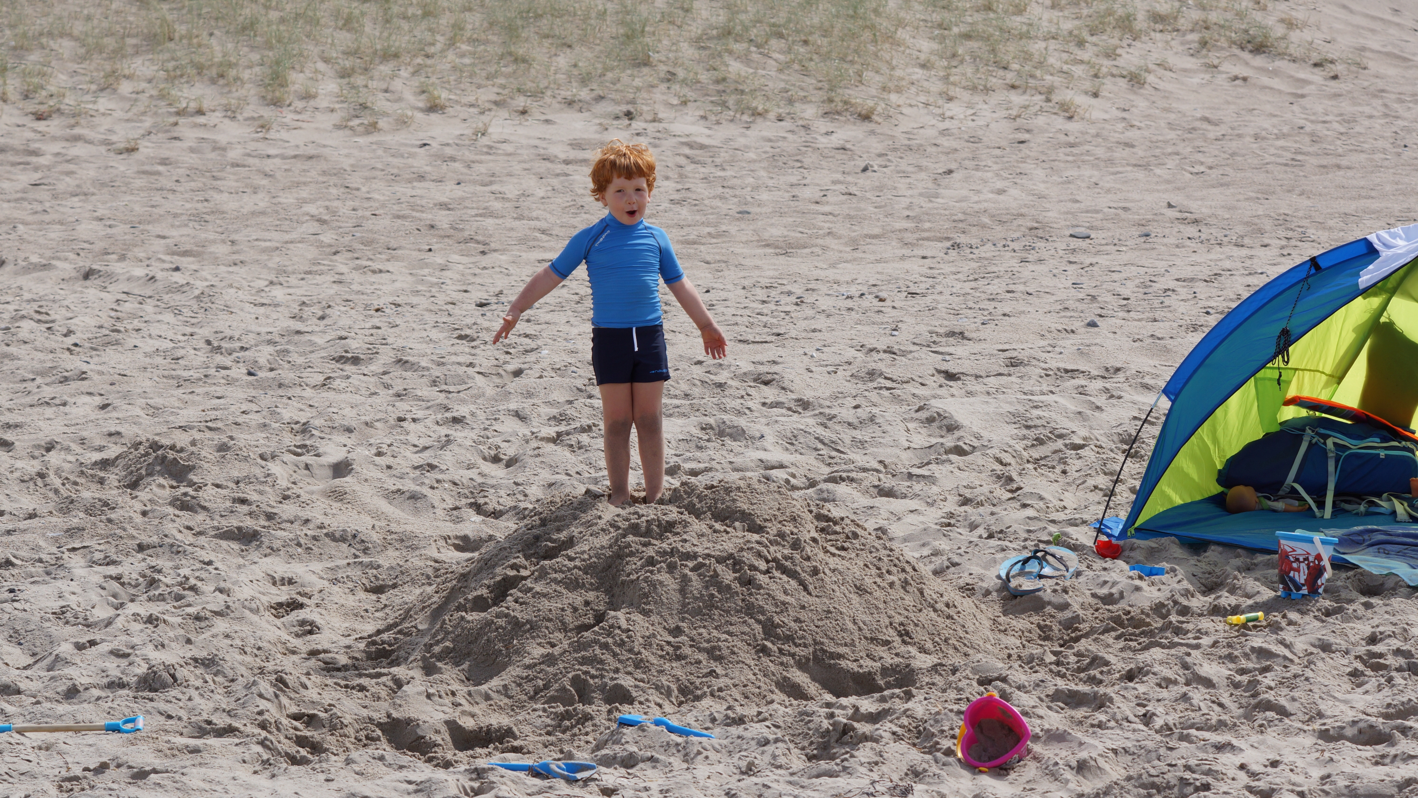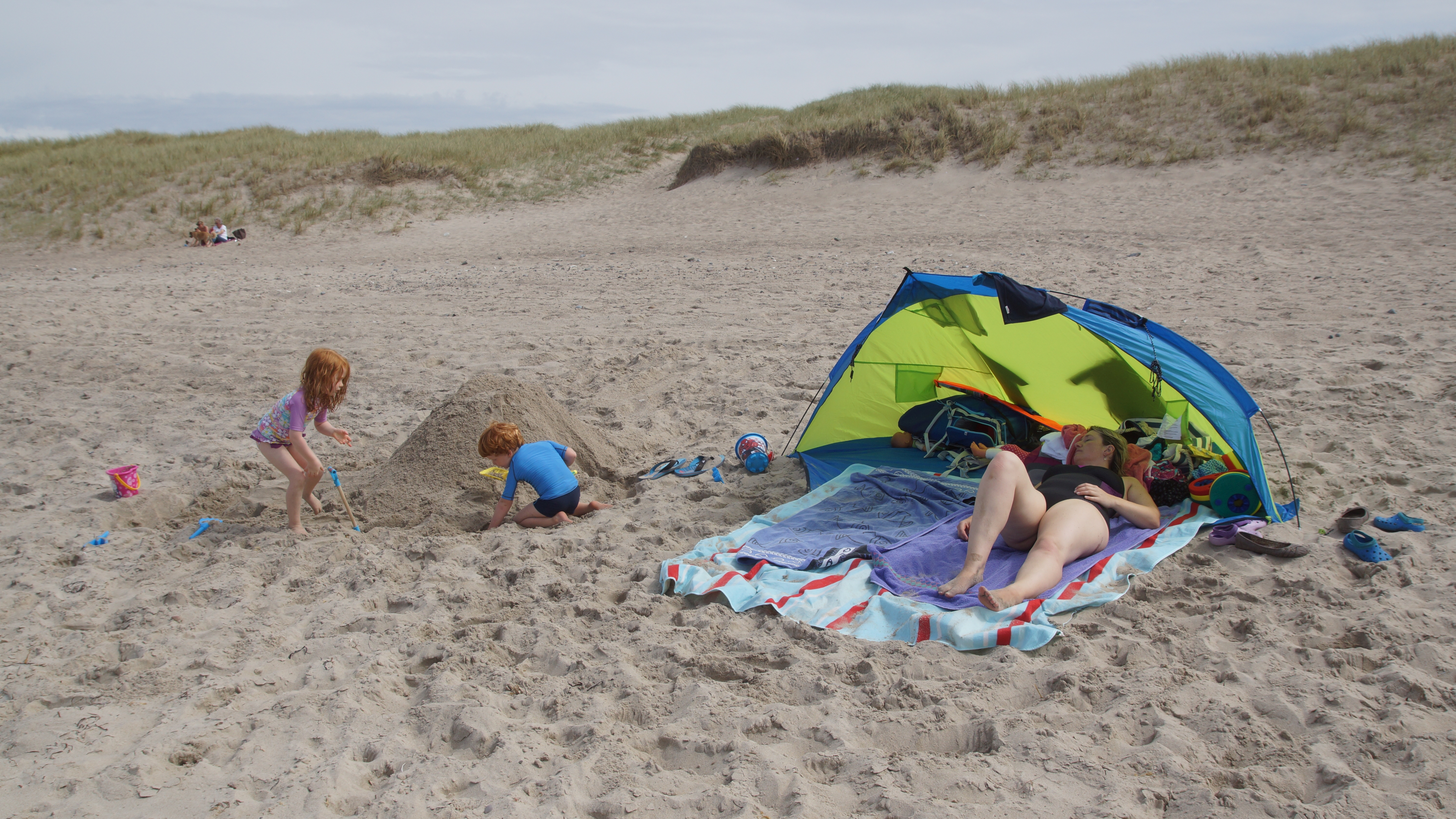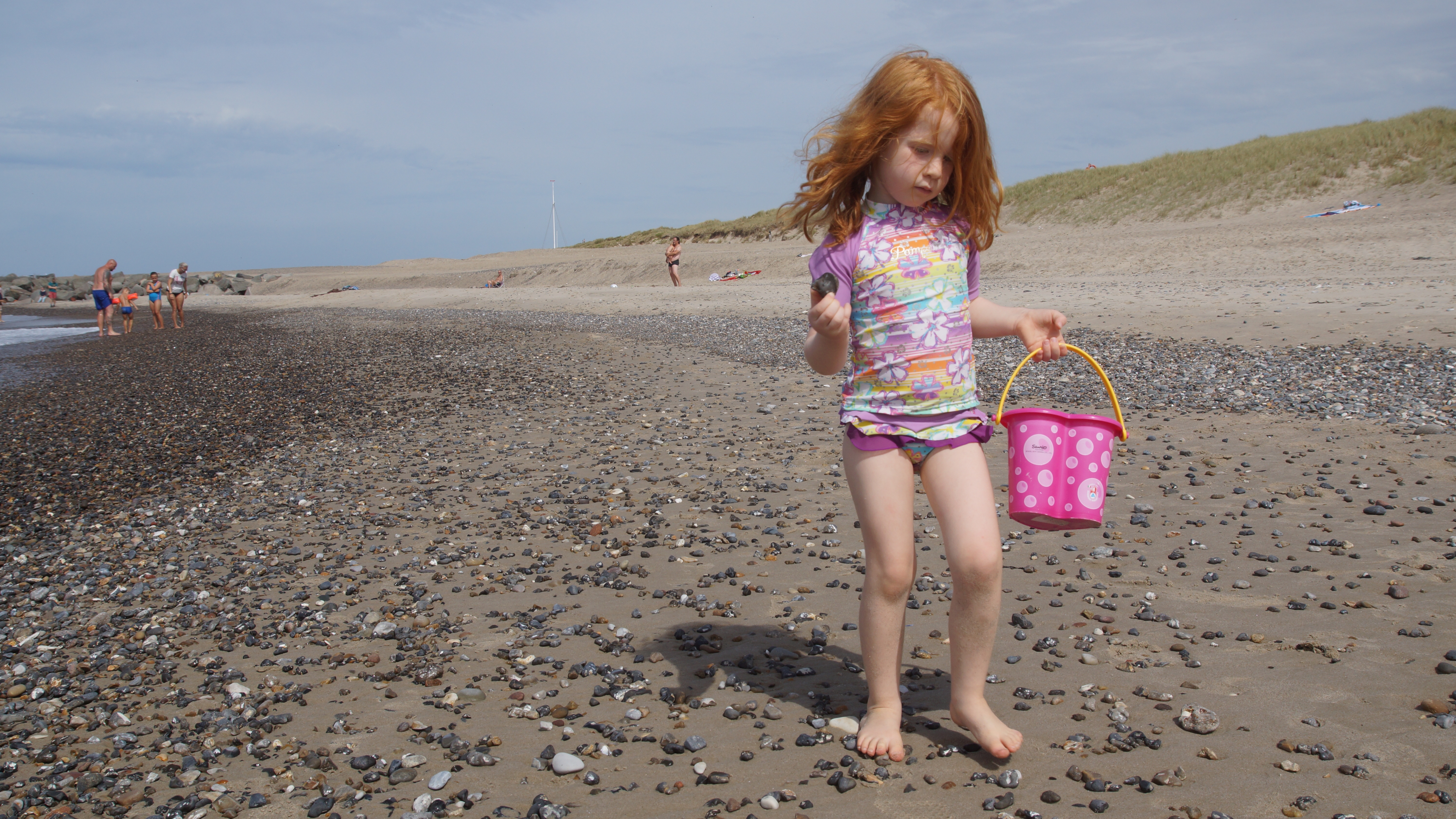 Nach dem leckeren Frühstück hieß es dann endlich für alle Badehosen und Badeanzüge anziehen und ab nach Agger zum Strand. Am endlosen Sandstrand verteilten sich die wenigen Strandgänger so gut, dass man völlig ungestört einen Platz für sich hatte. Hauptsächlich ein paar wenige weitere Familien mit Kindern tummelten sich ab und an in unserer Nähe. Aber ein wenig Leben am Strand ist ja auch schön.