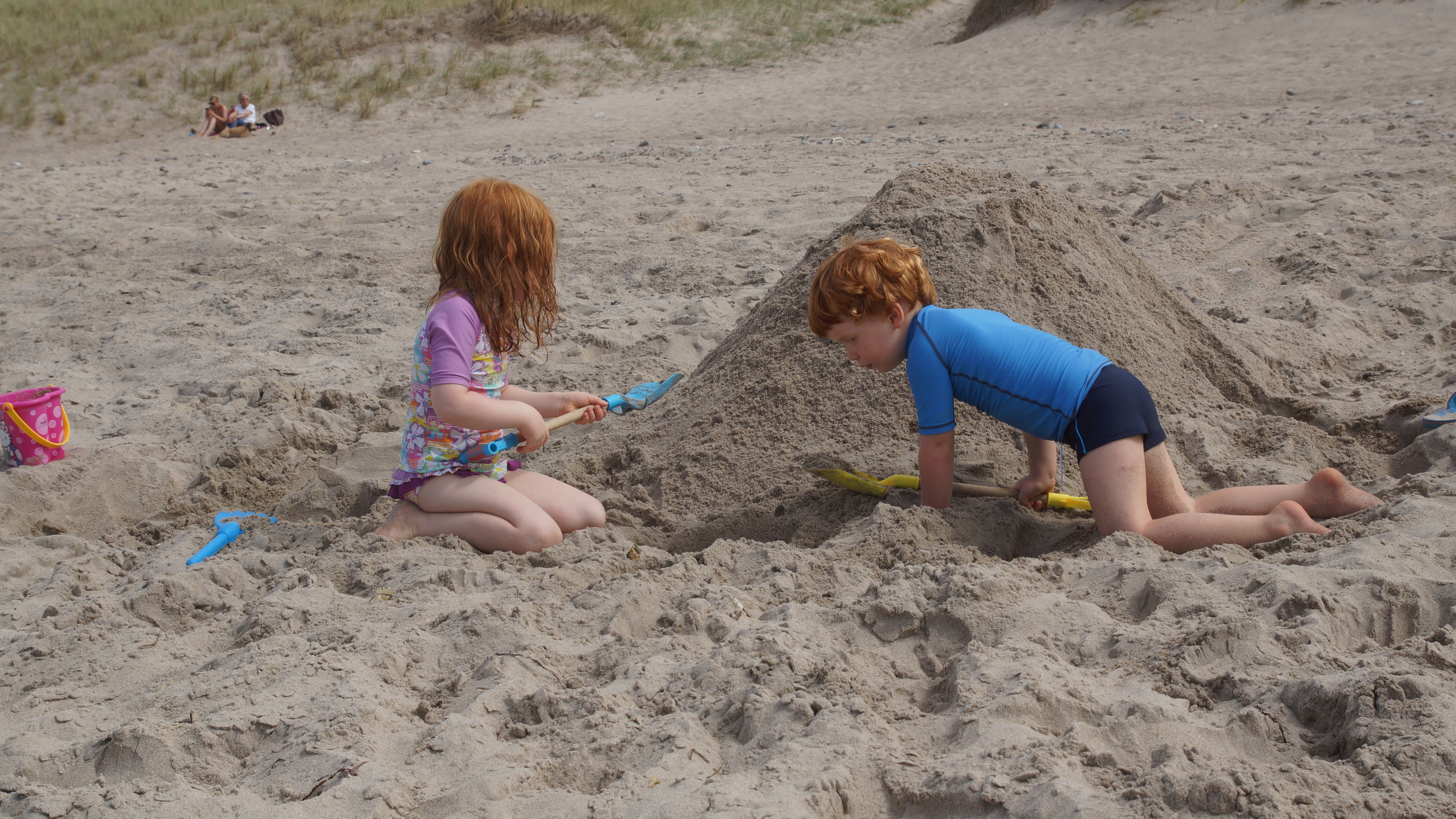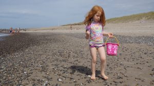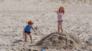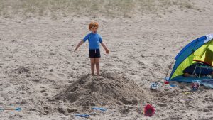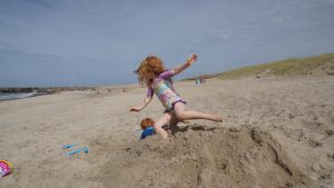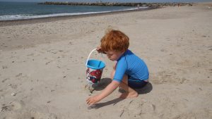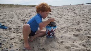 Kaum waren wir an unserem ausgemachten Platz, fingen die Kinder auch gleich an im Sand zu buddeln. Hier konnten wir es aushalten. Die nächsten Stunden verbrachten wir alle mit buddeln im Sand, Steine suchen und mit schwimmen in den Wellen der Nordsee. Amelie war sogar so mutig und ist ohne sich festzuhalten in den Wellen ganz alleine geschwommen. Das Auf und Ab in den Nordseewellen hat uns allen viel Spaß gemacht. Die größte Herausforderung war es immer ins Wasser rein zu kommen und über den Punkt zu gelangen, an dem die Wellen brachen. Das galt natürlich auch wieder beim Rausgehen, denn die Wellen haben hier schon ganz schön viel Kraft und Power.