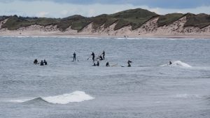 Direkt vom Strand geht eine sehr lange Mole hinaus ins Meer. Auf der Südseite liegt vor dem offenen Meer ein kleines geschütztes Freibad mit einer kleinen Öffnung zum Meer. Nördlich zieht sich ein langer Sandstrand hin, auf dem die Strandfischer ihre Boote haben und viele Surfer und Standup-Paddeler auf den Wellen reiten wollen. Wenn in den nächsten Tagen das Wetter besser wird, versuche ich hier vielleicht auch mal zu paddeln. Auf jeden Fall ist der Ort sehr niedlich. Aber während wir auf der Mole waren fing es auch hier an zu regnen.