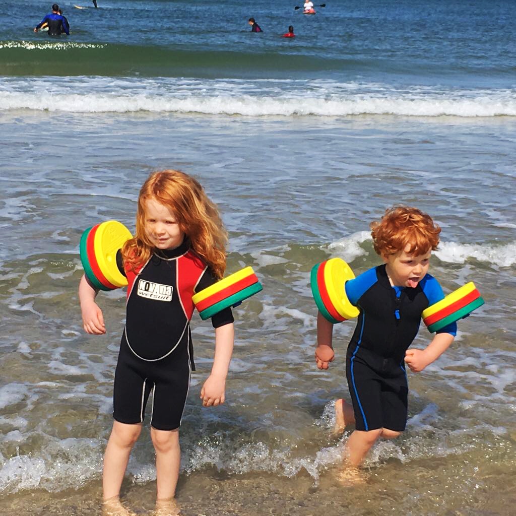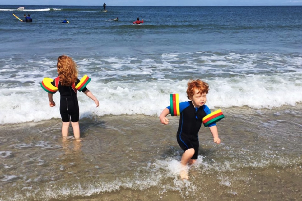 Allerdings waren die Wellen heute sehr flach,also genau richtig für mich, um zum ersten Mal mit meinem Board auf das offene Meer zu paddeln und um etwas in den Wellen zu spielen. Die Kinder wollten natürlich auch sofort ins Wasser, mussten sich aber etwas gedulden, bis ich mit dem ersten Paddelgang fertig war. Und der hat richtig Spaß gemacht. Da ich keine Leash, also eine Verbindungsleine von meinem Fuß zum Board habe, habe ich mich noch nicht getraut auf dem Board zu stehen und bin nur mit dem Kajakpaddel im Sitzen gefahren. Ich bin dann auch zu der Sandbank rausgepaddelt, hier konnte man auch wieder stehen, und bin auch tatsächlich ein Mal auf einer schönen Welle entlang gesurft. Dann bin ich mit den Kindern, die schon sehnsüchtig auf mich am Strand gewartet haben, in die kleinen Wellen gesprungen. Das hat uns allen viel Spaß gemacht. Amelie schafft es sogar schon über die Wellen rüber zu schwimmen.