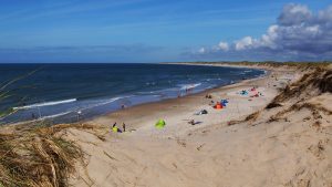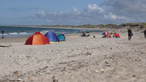 In Nørre Vorupør haben wir noch gut einen Parkplatz an den Dünen bekommen, so dass wir nur über diese rüber gehen mussten und schon waren wir am Strand. Schnell haben wir uns ein Plätzchen gesucht und unsere Strandmuschel aufgebaut. Der Strand ist hier viel voller als bei uns in Agger, was an den vielen Surfern liegt. Der Strand fällt hier viel flacher ins Meer und ca. 30 Meter ins Meer raus ist eine Sandbank, die viel bessere Wellen zum Surfen garantiert.