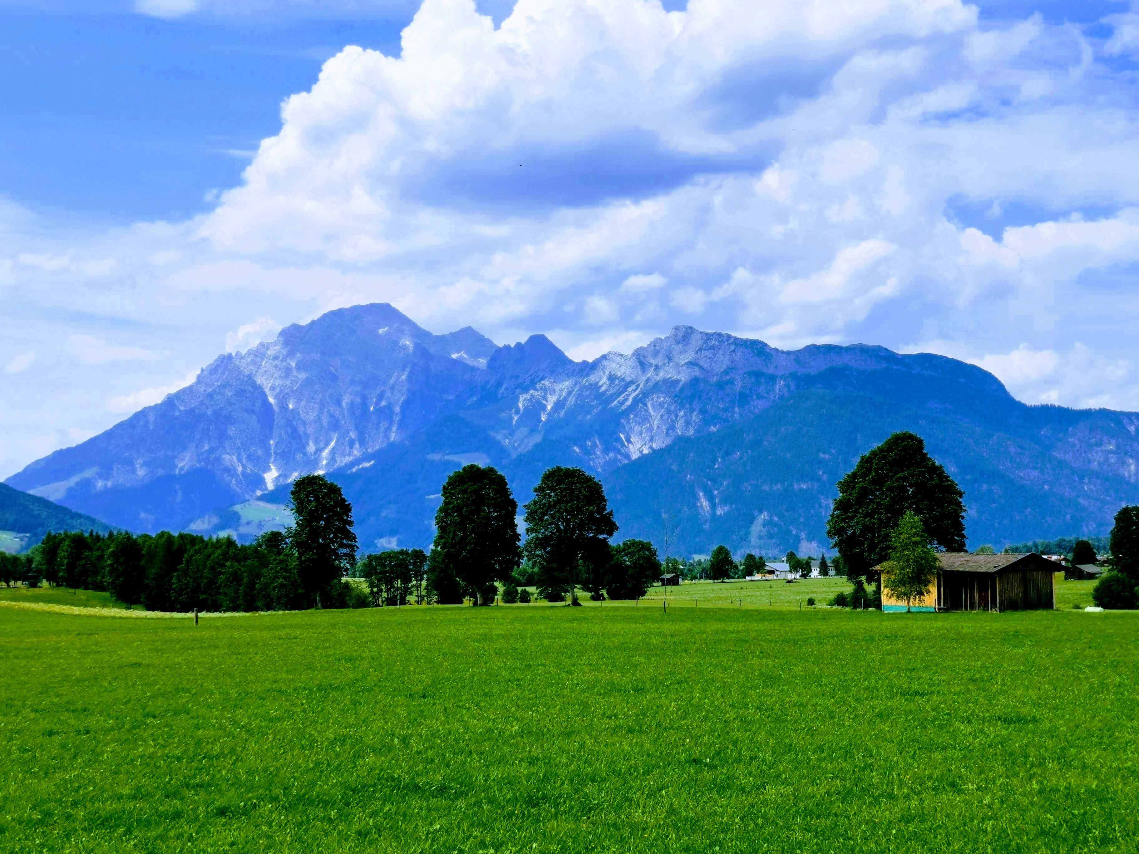 Auf der weiteren Wanderung haben wir immer wieder rechts und links des Weges nach besonderen Tieren geguckt. Wir entdeckten z.B. Grashüpfer, kleine Eidechsen und Libellen. Amelie und Lea sammelten fleißig Grashalme, um diese später auf der Terrasse zu flechten. Finn versuchte auch Grashalmen zu pfeifen, so wie ich es im gezeigt hatte. Immer wieder konnten wir die tolle Kulisse mit der beeindruckenden Bergkette des Steinernen Meers bewundern. Und hin und wieder konnten wir in der Ferne das Großglocknermassiv entdecken.