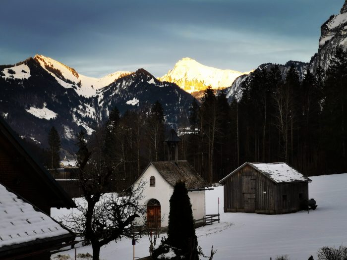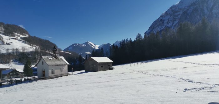 Pünktlich um 09:50 Uhr standen wir mit Skischuhen und Skiern am verabredeten Treffpunkt der Brummi Skischule Mellau auf dem Übungshang. Und nach der ersten Gruppeneinteilung ging es dann auch gleich bei den kleinsten Übungsanlagen los. Die ersten 10 Minuten habe ich noch zugeschaut. Damit Amelie und Finn aber nicht ständig zu mir schauen und sich auf den Skilehrer und die Gruppe konzentrieren, bin ich dann losgezogen und habe den Ort etwas erkundet und dabei die überflüssigen Skistöcke der Kinder zurück zu unserer Ferienwohnung gebracht. Mellau ist ein kleines niedliches Bergdorf durch das man dann auch schnell durchgelaufen war.