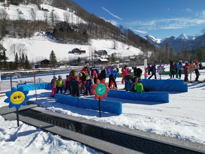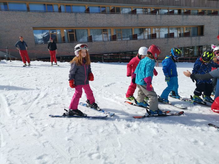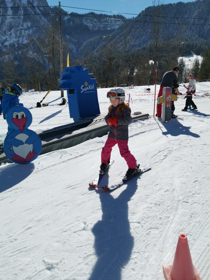 Um den Kindern noch etwas zuzugucken, bin ich dann 30 Minuten vor der Mittagspause um 12 Uhr zum Übungshang zurückgekehrt. Die Skigruppen waren fleißig am üben. Amelie war bereits in einer der Gruppen, die schon etwas fortgeschrittener waren. Beide Gruppen, die von Finn und die von Amelie, übten noch fleißig den Schneeflug an den kleinen Übungsanlagen.