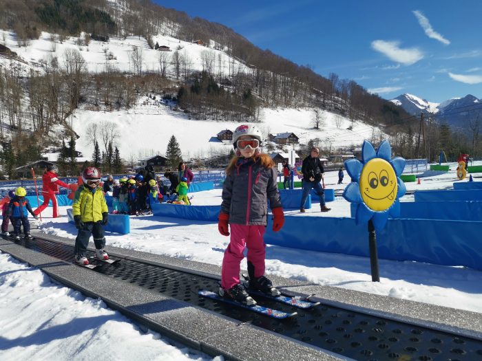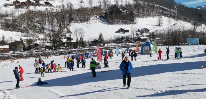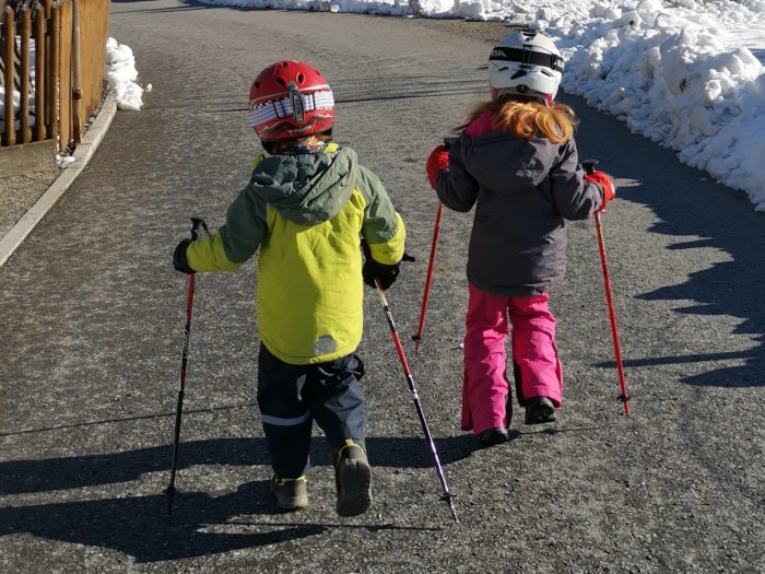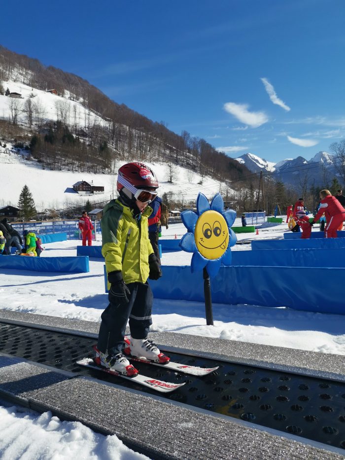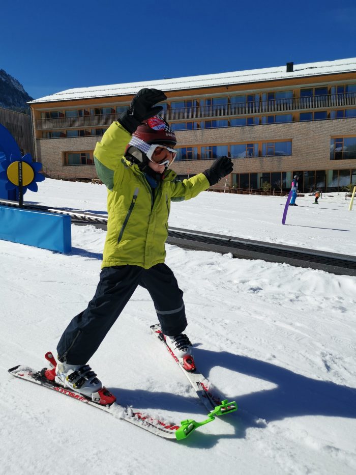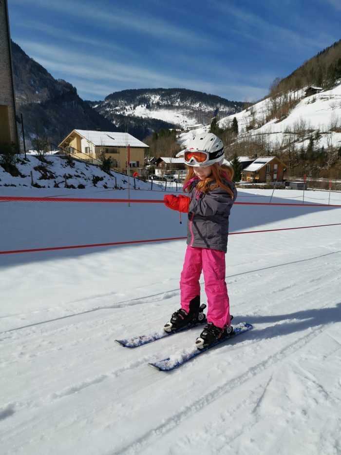 Aber der Reihe nach. Morgens kitzelte uns bereits die Sonne aus dem Bett. Der perfekte Tag für den ersten Tag auf Skiern. Also machten wir uns dann auch schnell nach dem Frühstück pistenfertig: Skiunterwäsche, Skihose, Skijacke, Sonnencreme und natürlich Skihelm und Skibrille. Die Skier und Skischuhe aus dem Auto haben wir uns unter den Arm geklemmt und dann ging es zu Fuß zur Talstation und zum Übungshang. Dieser liegt etwa 300 Meter von unserer Wohnung entfernt aber der Fußmarsch tat uns morgens gut.