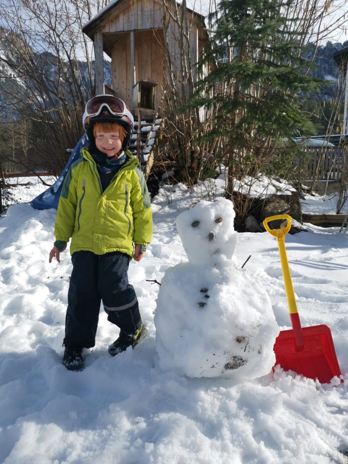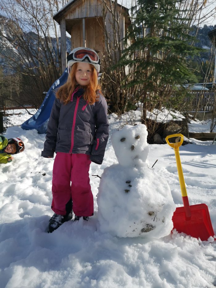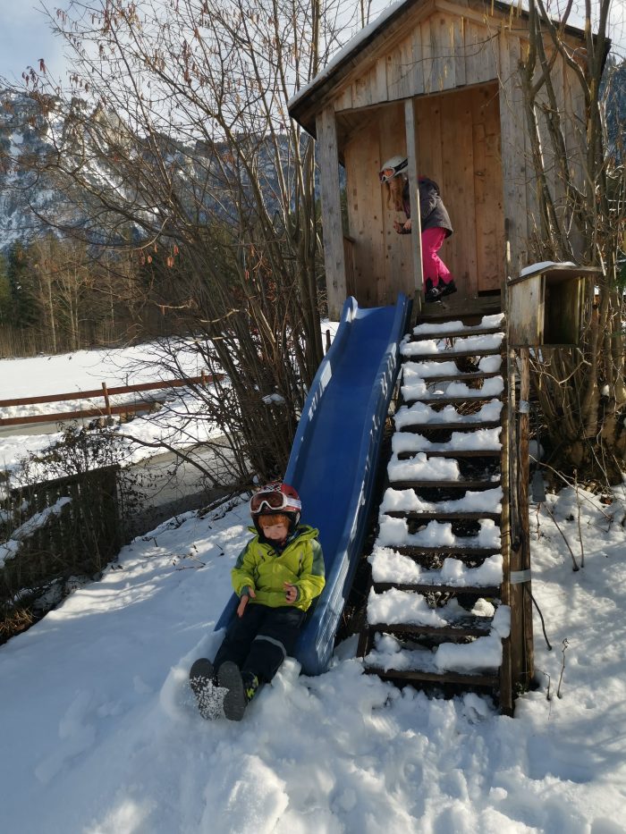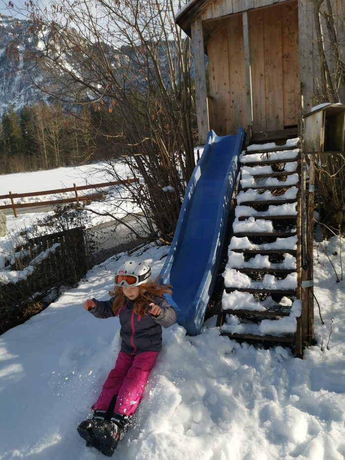 Als ich Amelie von ihrer Gruppe abgeholt hatte, war sie so begeistert, dass sie noch zweimal mit mir nebenher rennend den ganzen Hang abfahren wollte. Nachdem wir auch Finn abgeholt hatten, sind wir die 300 Meter den Berg hoch zu unserer Ferienwohnung gelaufen. Anscheinend waren die Kinder immer noch nicht genug ausgelastet, so dass wir uns noch etwas im Schnee im Garten ausgetobt haben. Wir haben einen kleinen Schneemann gebaut und die Rutsche machte mit dem Schnee gleich doppelt Spaß.