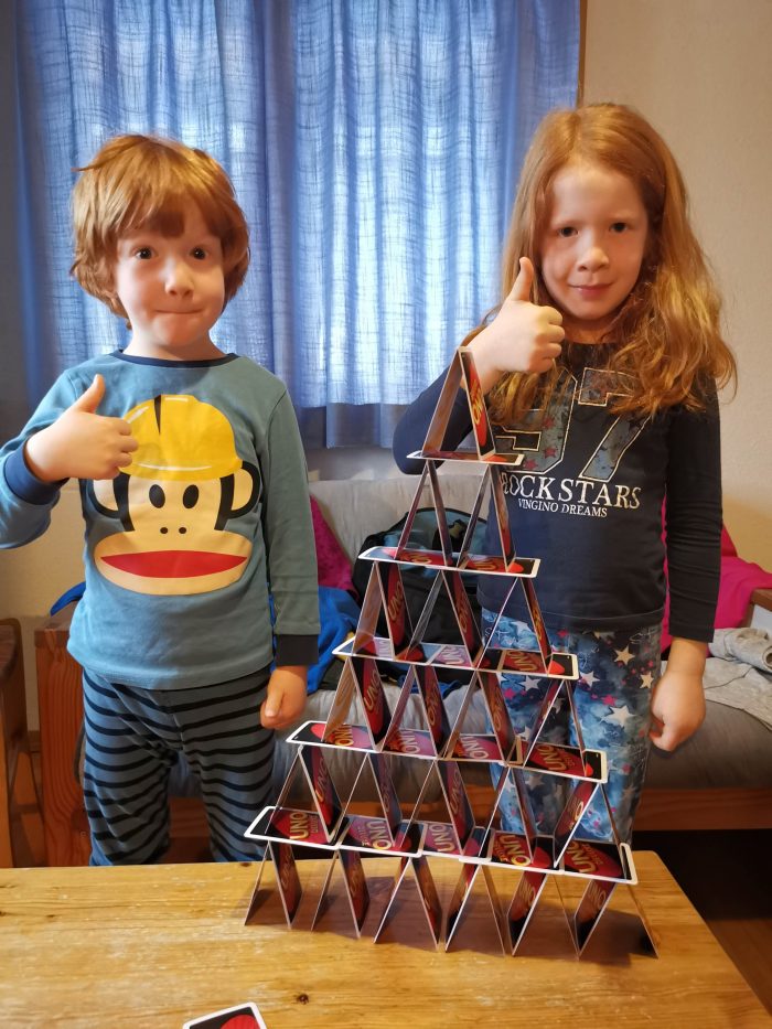 Heute Morgen sind die Kinder schon früh aufgestanden und haben zusammen im Wohnzimmer gespielt. Mit anfänglichem Frust wegen der vielen Einstürze und etwas Hilfe haben sie aber dann ein super Kartenhaus gebaut und waren stolz wie Bolle.