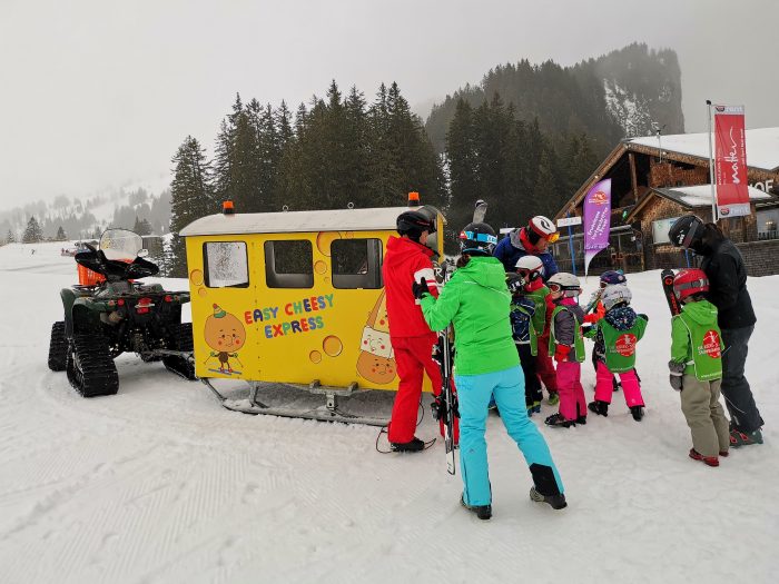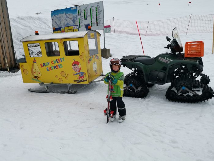 Danach ging es wie jeden Tag nach dem Frühstück zu Fuß zur Talstation. Hier mussten wir uns wieder trennen. Diesmal durfte ich mit Amelie in der Gondel zu Bergstation fahren und Sandra hat Finn zum Übungshang im Tal gebracht. Heute wartete der letzte kostenlose Skikurs auf die Kinder. Aber wir waren uns alle einig, dass wir den Skikurs für beide noch verlängern wollten. Oben am Treffpunkt habe ich Amelie zum Skikurs abgegeben und für die Kinder ging es wieder in das Kindertaxi.