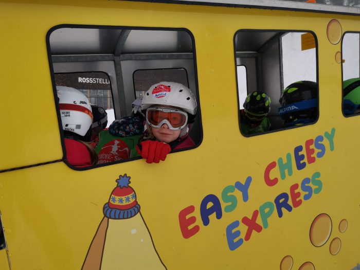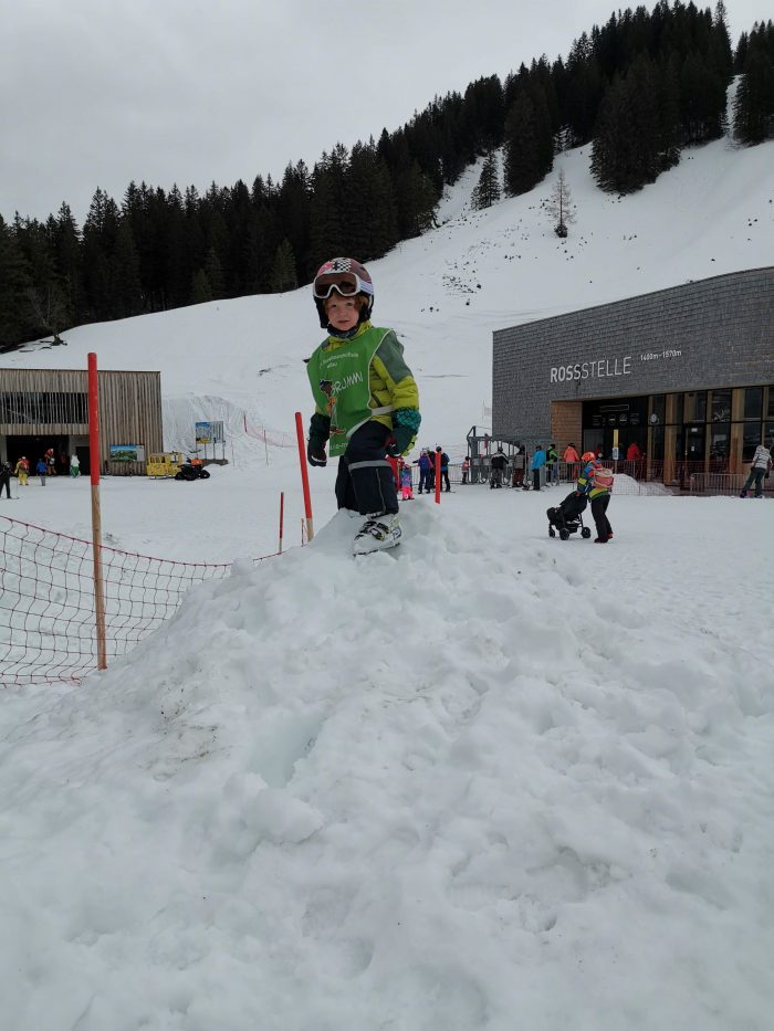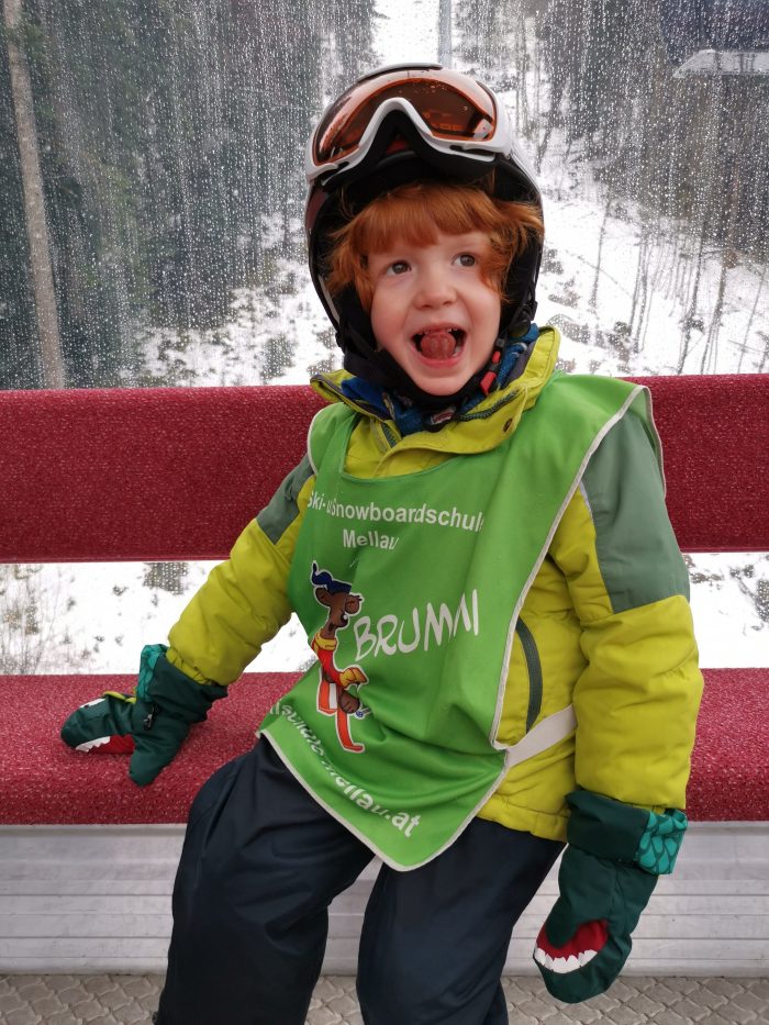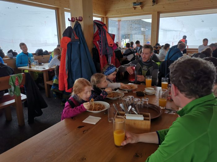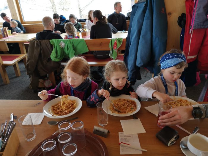 Zum Mittagessen bin ich dann wieder mit der Gondel zu Finn runtergefahren. Und zum Glück bekamen wir dann die gute Nachricht, dass es nun auch für Finn nach dem Mittag oben im Skigebiet weitergehen würde. Finn war natürlich total stolz. Und unsere große Amelie war so glücklich mit ihrer Skigruppe und ihrem Skilehrer Julian Essen zu gehen.