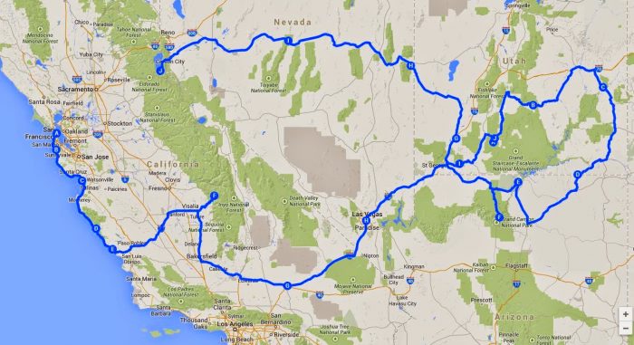 Die ersten drei Tage haben wir uns in San Francisco ziemlich zentral ein kleines Hotelzimmer gemietet, bevor wir dann am Freitag unser Wohnmobil abholen, juhu… Hier könnt Ihr Euch mal die grob geplante Route anschauen…