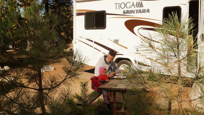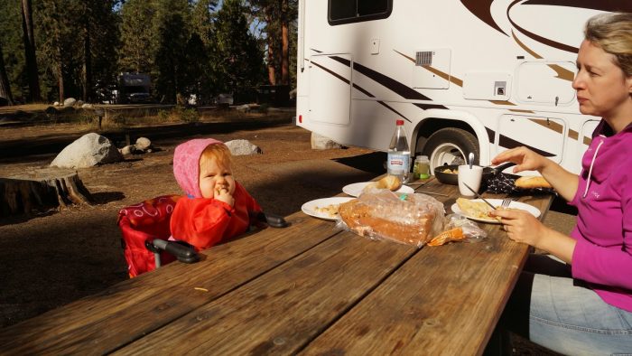 Heute stand zum Glück keine Fahrt auf dem Programm. So haben wir zu Dritt noch etwas im Bett rumgelümmelt und dann bei herrlichem Sonnenschein draußen gefrühstückt.