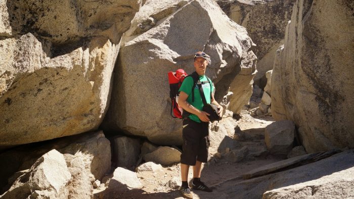 Nach der morgentlichen Stärkung und etwas Spielen bzw. Abwaschen, sind wir einen Trail zu einem Wasserfall gewandert. Der Trail hat gute 2 Stunden gedauert und Amelie hat entweder staunend aus der Kiepe gelukt oder geschlafen. Der Weg zu dem Wasserfall war wunderschön und nicht zu sehr überlaufen. Er führte immer am Fluß entlang, der leider jetzt im Spätsommer nur sehr wenig Wasser mit sich führte.