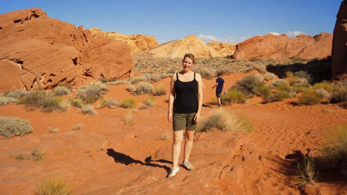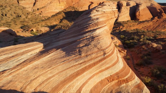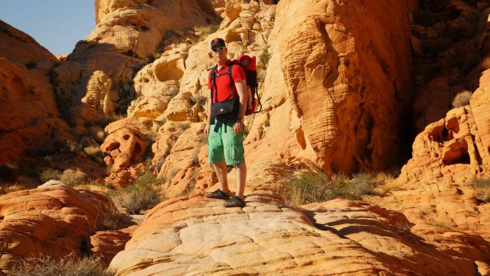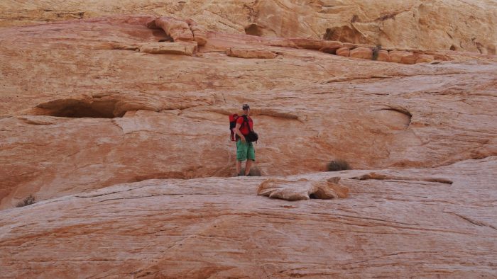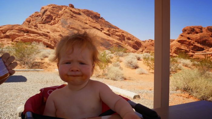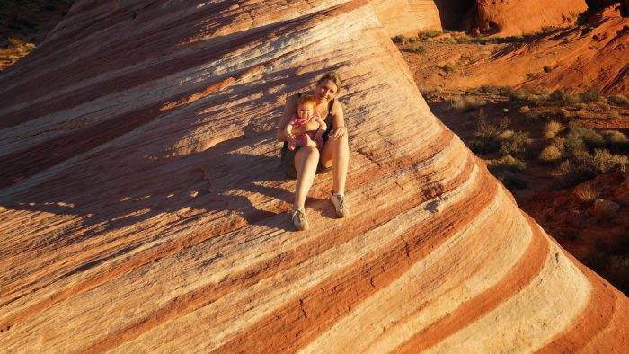 Nach dem wir bis ans Ende der Straße gefahren waren, sind wir noch zur Fire Wave gewandert. Die Fire Wave ist ein Felsen, geformt wie eine Welle, der in verschiedenen Farben in der Sonne schimmert. Wirklich toll. An der Fire Wave haben wir ein Paar aus Münster mit kleinem Kind kennengelernt, die ebenfalls in USA-Elternzeit sind. Mit diesem Paar haben wir uns dann an der Wave etwas verquatscht und als wir zurück am Parkplatz waren, schimmerten die Felsen durch die Abendsonne wunderbar feuerrot.