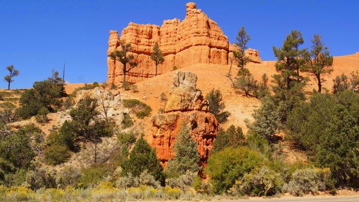 Kurz vor dem Bryce Canyon fährt man noch durch den Dixie National Forest, der schon beeindruckende Felsen zu bieten hat, die allerdings durch den Bryce Canyon in den Schatten gestellt werden.