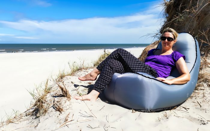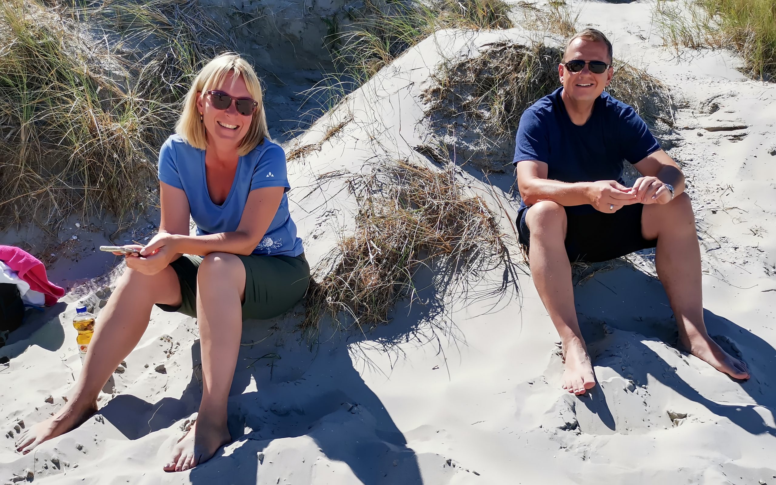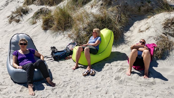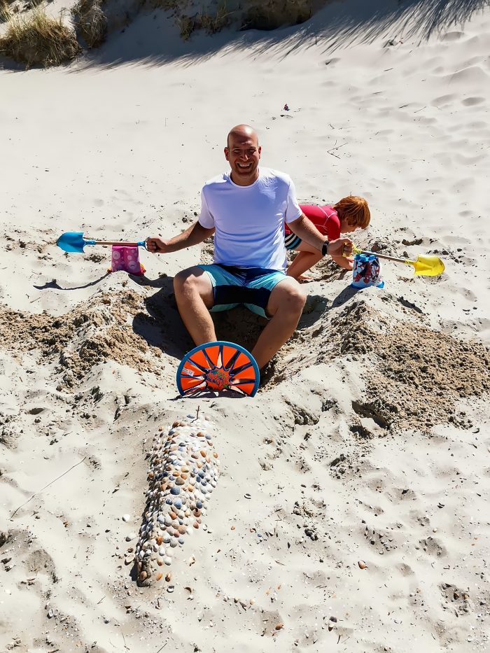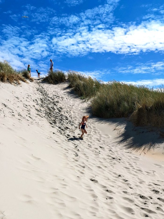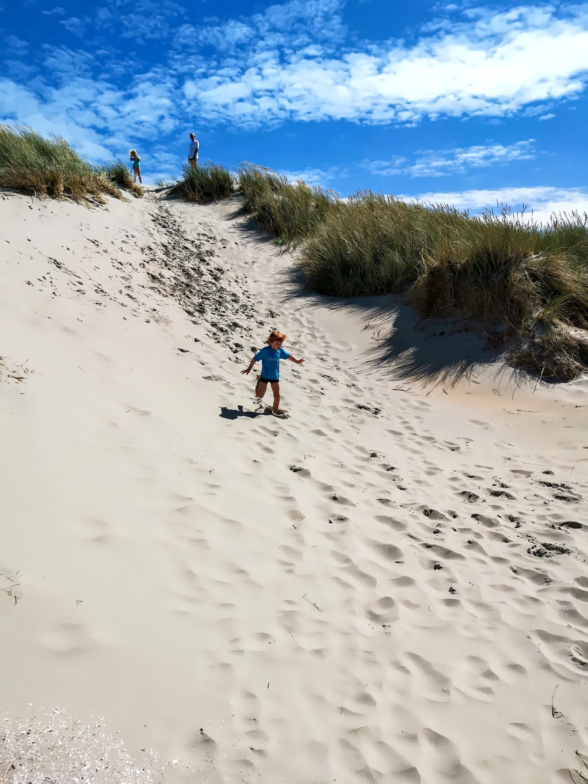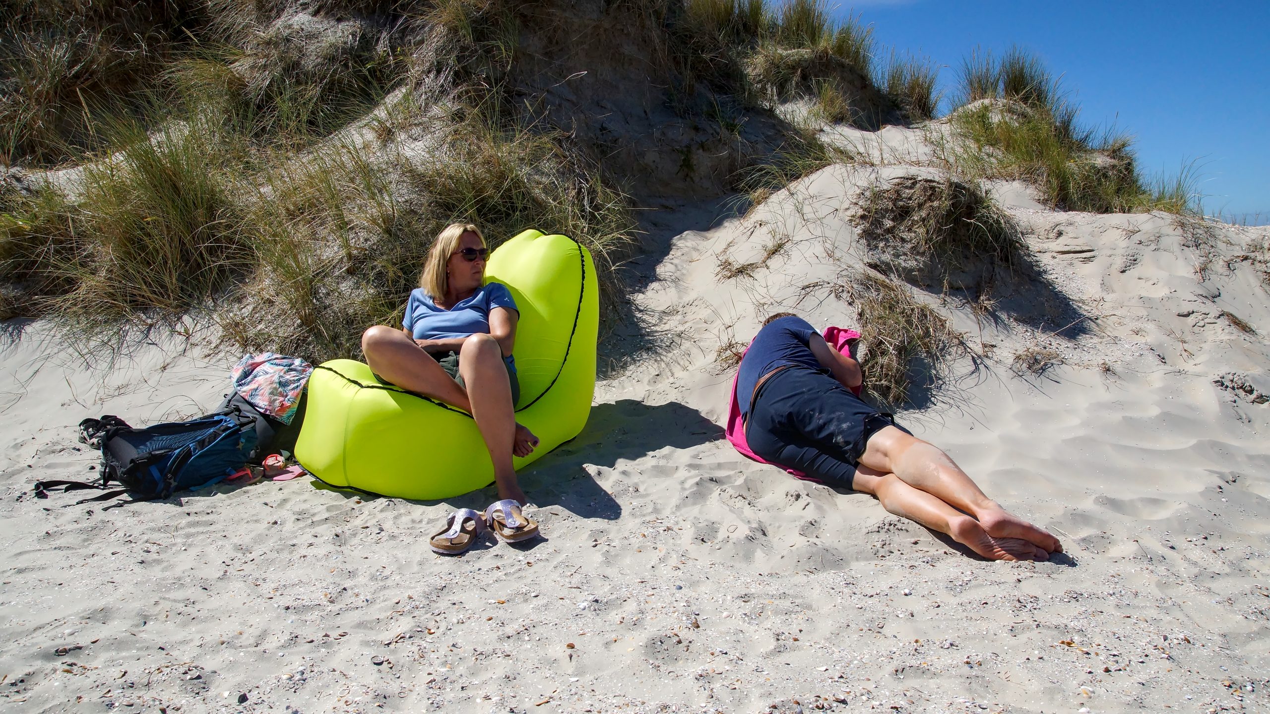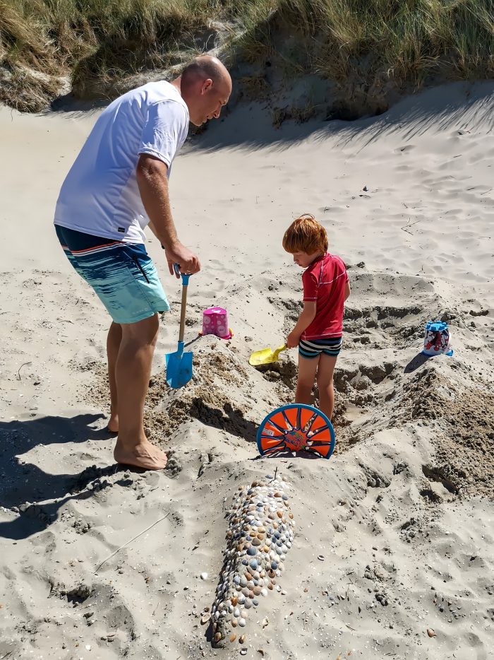 Nachdem alle eingecremt waren und wir alles Strandspielzeug zusammengepackt hatten ging es los. Wir hatten Glück und wir konnten in den Dünen eine windgeschützte Kuhle besetzen.