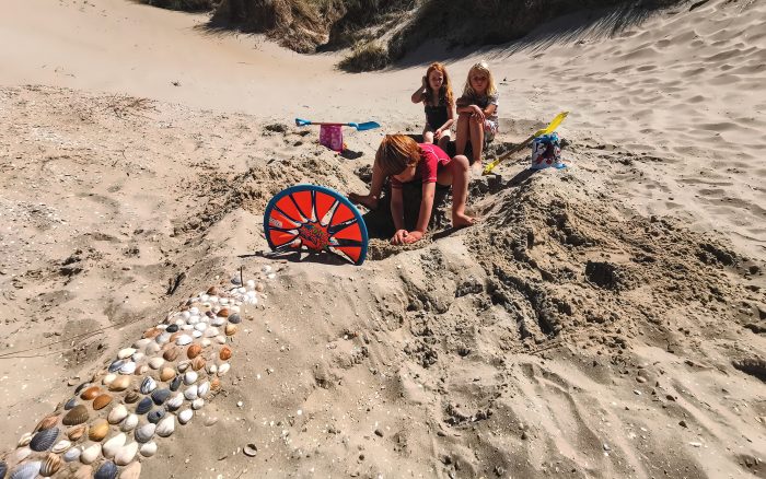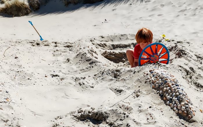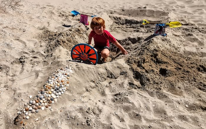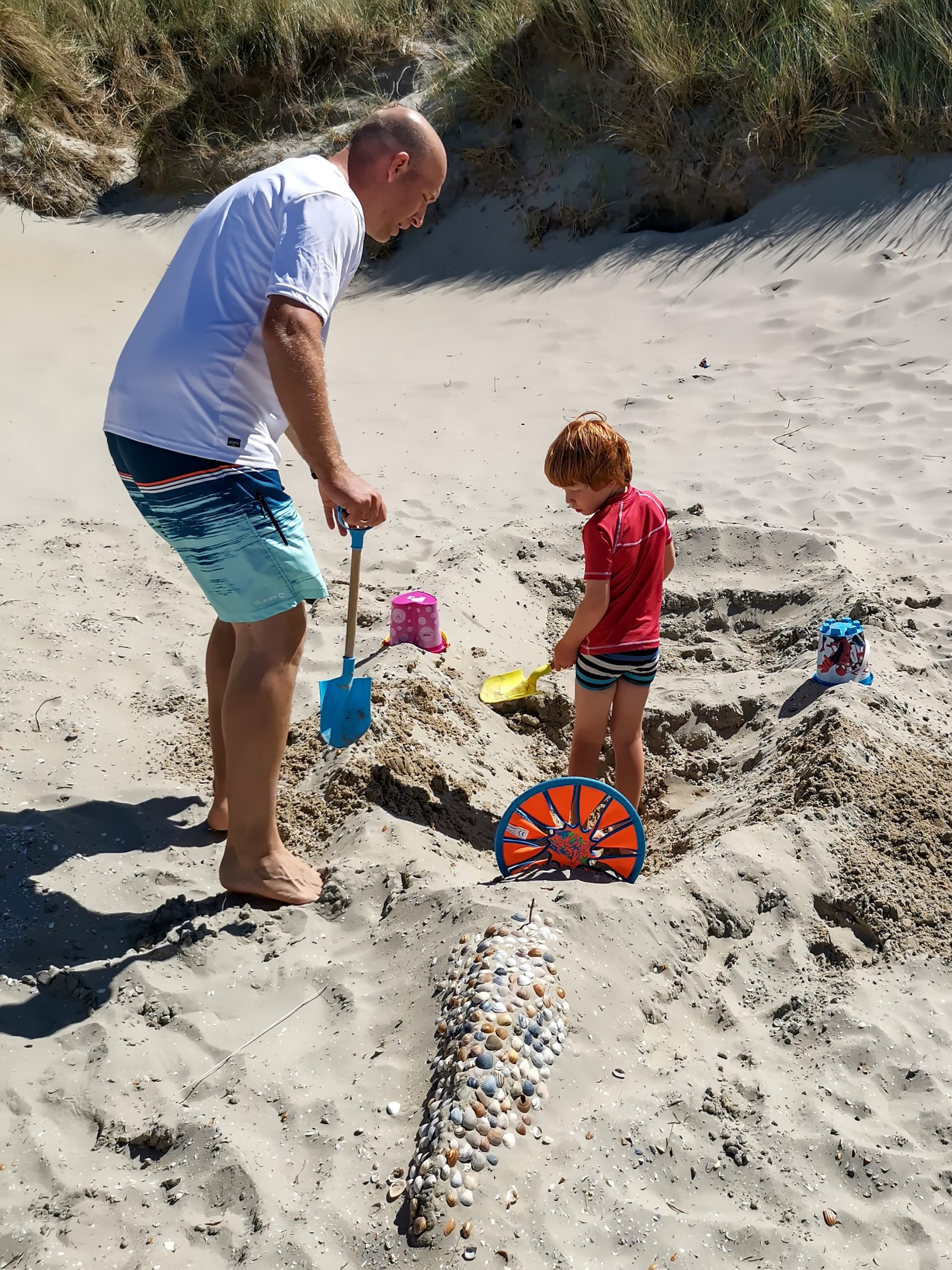 Danach habe ich mit Finn zusammen ein Ruderboot in den Sand gebaut. Das Sandruderboot hatte alles was ein richtiges Ruderboot braucht: Eine Sitzbank und Ruder – und falls die Ruder ins Wasser fallen hatte Finn auch an ein Lenkrad, Schaltknöpfe aus Muscheln und an eine Schiffsschraube gedacht.