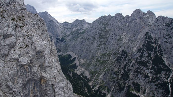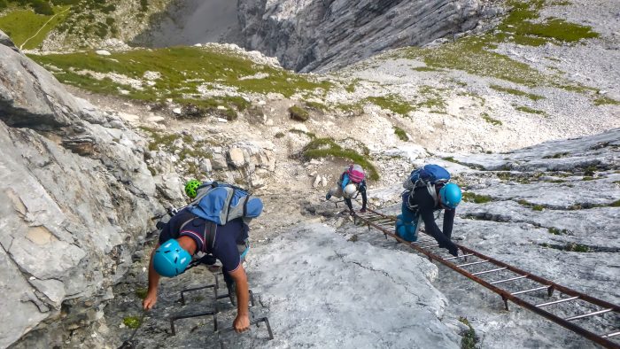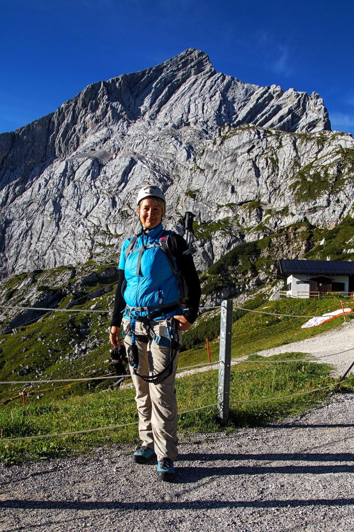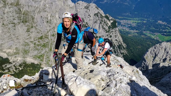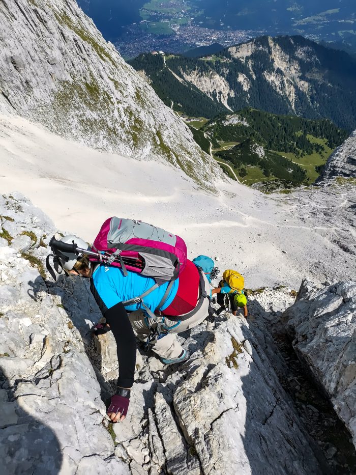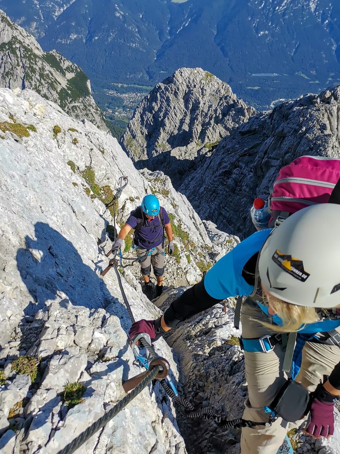 Nach wenigen Metern und einer kleinen Kletterpassage, die wir ohne Sicherung am Seil bewältigen konnten, waren wir dann beim Einstieg des Klettersteigs. Dieser beginnt mit einer ca. 5 Meter hohen markanten Klammern-Leiter. Unsere Bergführerin Moni stieg ab hier dann immer voraus und erklärte uns super, wie wir uns zu verhalten hatten. Über weitere Drahtseilsicherungen und Steigklammern im Fels erreichten wir dann einen grasigen Absatz, von wo aus wir einen ersten Blick ins Höllental und hinüber zur benachbarten Zugspitze hatten.
