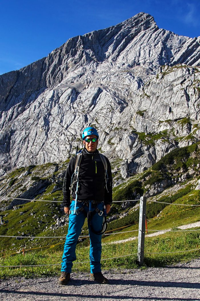 Der Wecker klingelte Sandra und mich heute bereits um 6:15 Uhr aus dem Bett. Heute erwartete uns die geführte Klettersteigtour auf die Alpspitze, dem Wahrzeichen von Garmisch-Partenkirchen. Die Kinder wollten unbedingt mit uns mit aufstehen und um 6:50 Uhr waren Oma und Opa da, um mit den Kindern zu frühstücken und den Tag zu verbringen. Um kurz nach 7 Uhr saßen wir dann im Auto auf dem Weg unserem Treffpunkt an der Talstation der Alpspitzbahn, wo wir um 7:45 Uhr unsere Verabredung mit unseren Bergführerinnen (Moni und Johanna) und der insgesamt 9 köpfigen Gruppe hatten. Nachdem alle ihre Tickets gekauft hatten, ging es mit der ersten Gondel hinauf zur Bergstation der Alpspitzbahn.