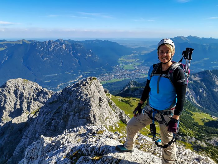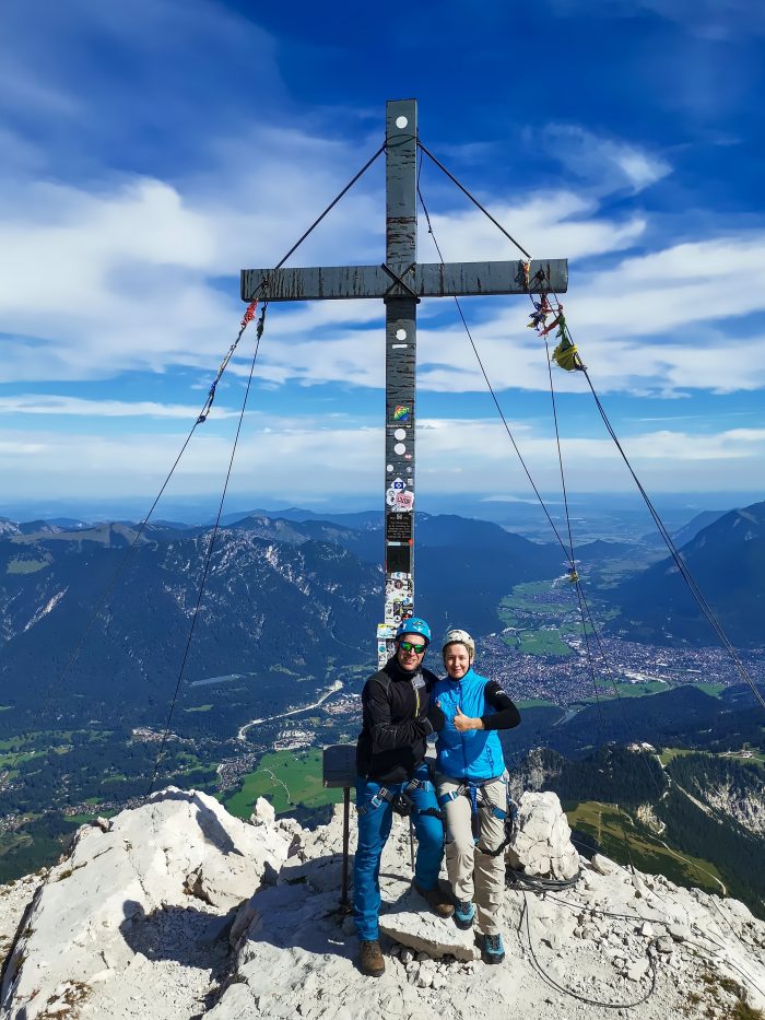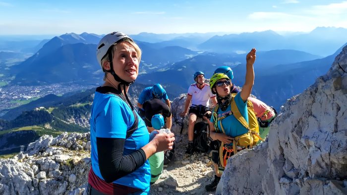 Und dann waren wir überglücklich und stolz oben am Gipfel der Alpspitze auf 2.628 Meter. Nach einem Gruppenfoto konnten wir dann die fantastische Aussicht genießen. Von hier oben hatten wir sowohl traumhafte Blicke ins Höllental und auf die Zugspitze sowie auf die gesamte Zugspitz Region mit Garmisch-Partenkirchen, die Ammergauer Alpen, das Wettersteingebirge und die Mieminger Kette.