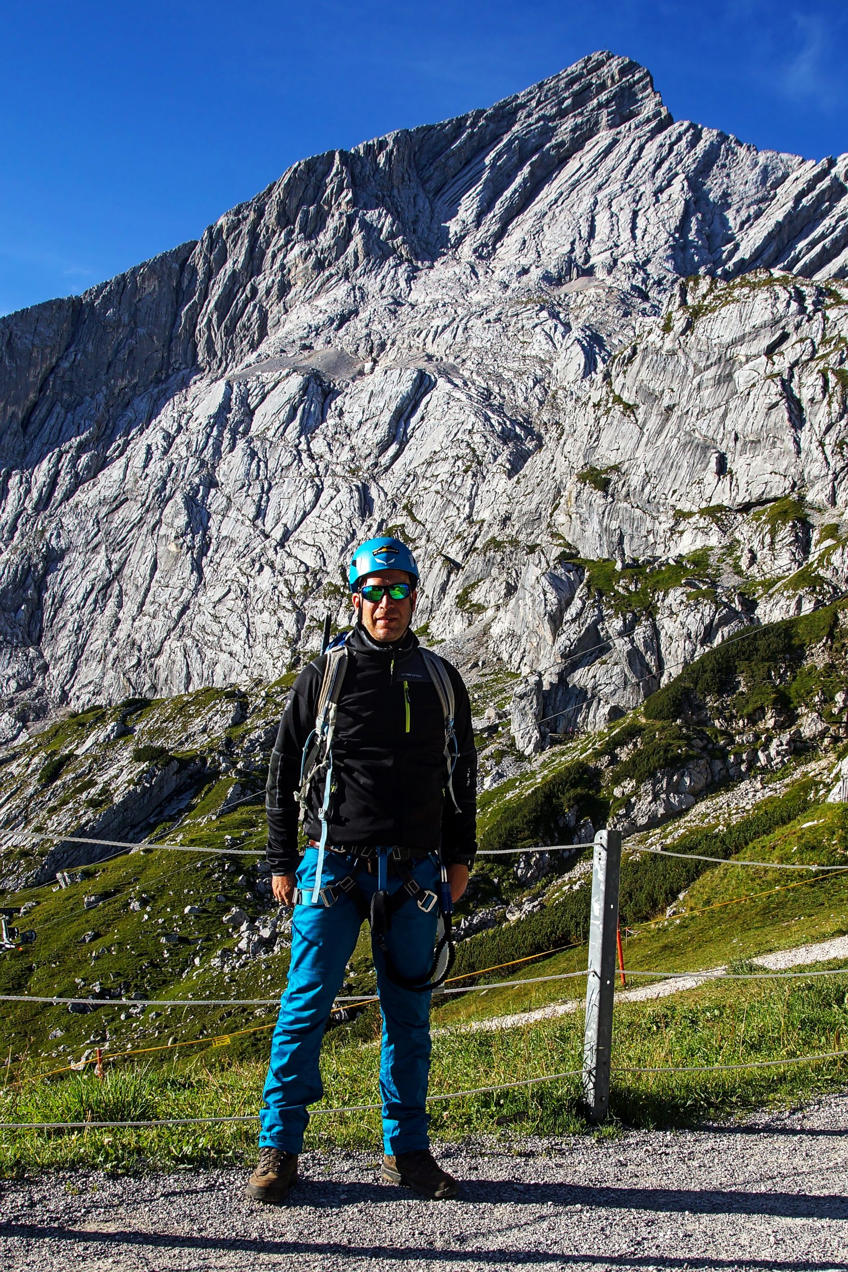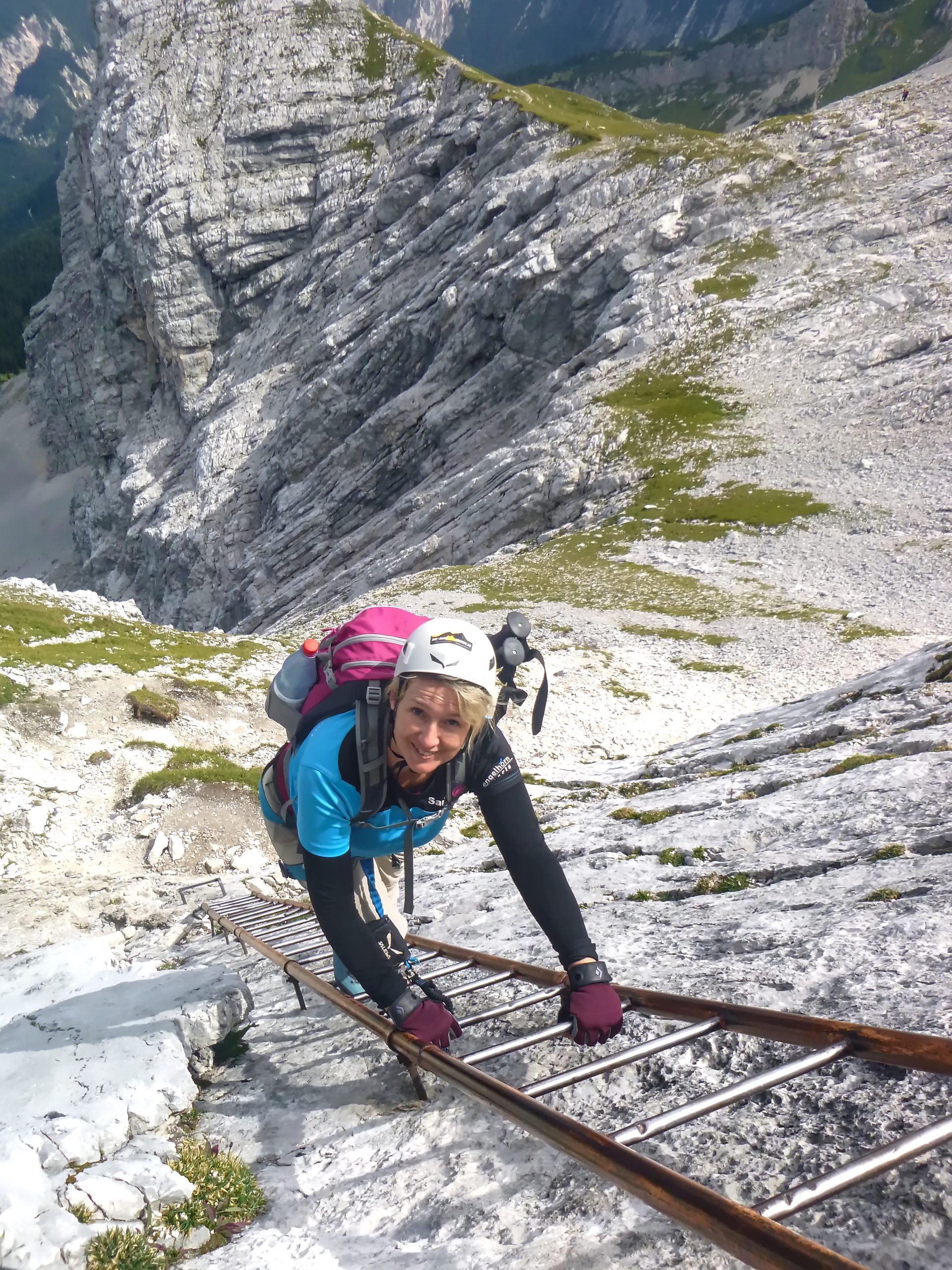 Nach wenigen Metern und einer kleinen Kletterpassage, die wir ohne Sicherung am Seil bewältigen konnten, waren wir dann beim Einstieg des Klettersteigs. Dieser beginnt mit einer ca. 5 Meter hohen markanten Klammern-Leiter. Unsere Bergführerin Moni stieg ab hier dann immer voraus und erklärte uns super, wie wir uns zu verhalten hatten. Über weitere Drahtseilsicherungen und Steigklammern im Fels erreichten wir dann einen grasigen Absatz, von wo aus wir einen ersten Blick ins Höllental und hinüber zur benachbarten Zugspitze hatten.