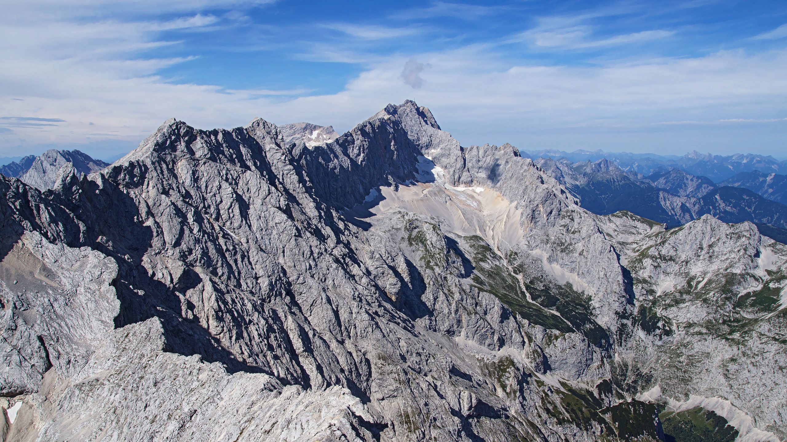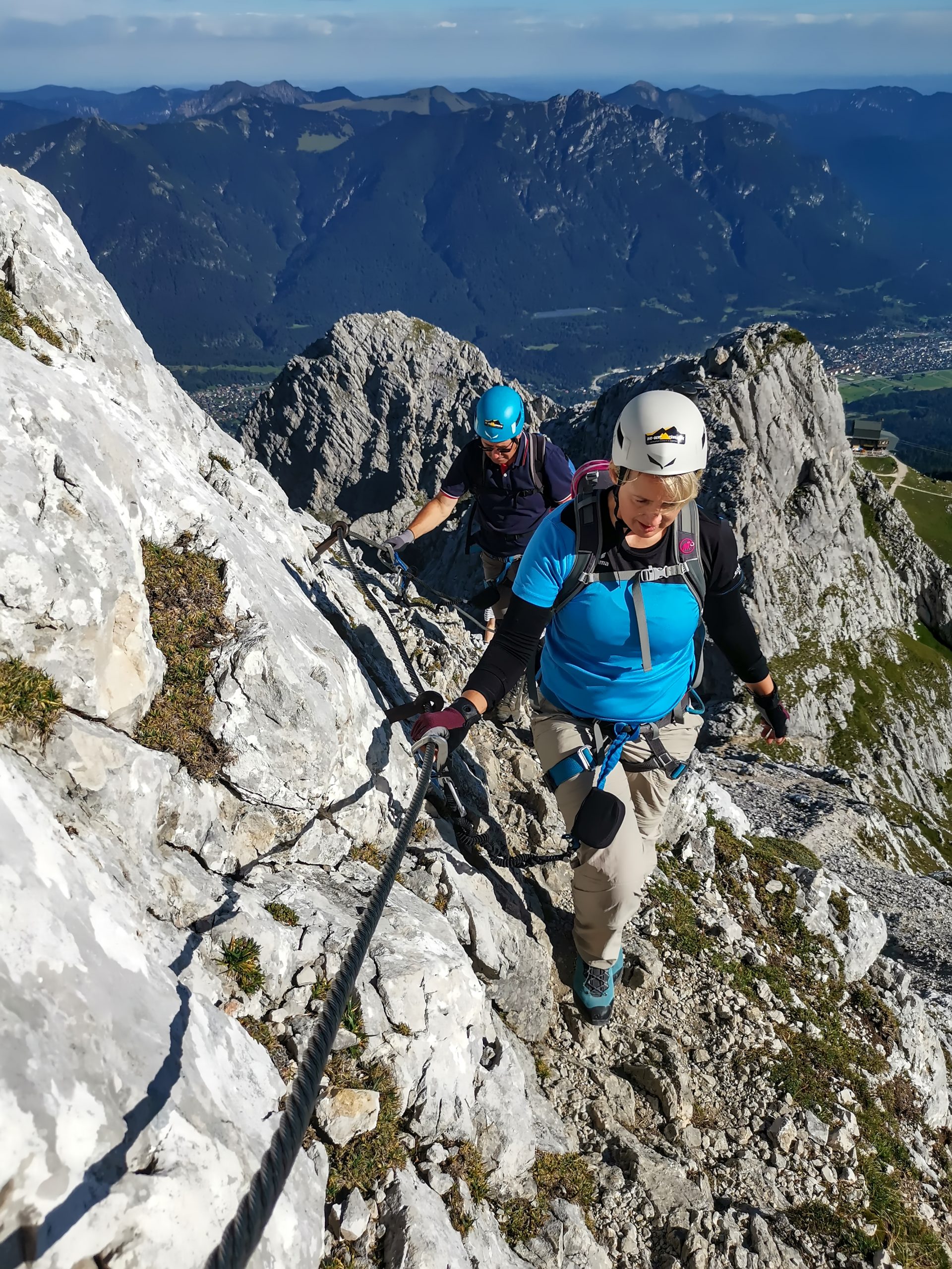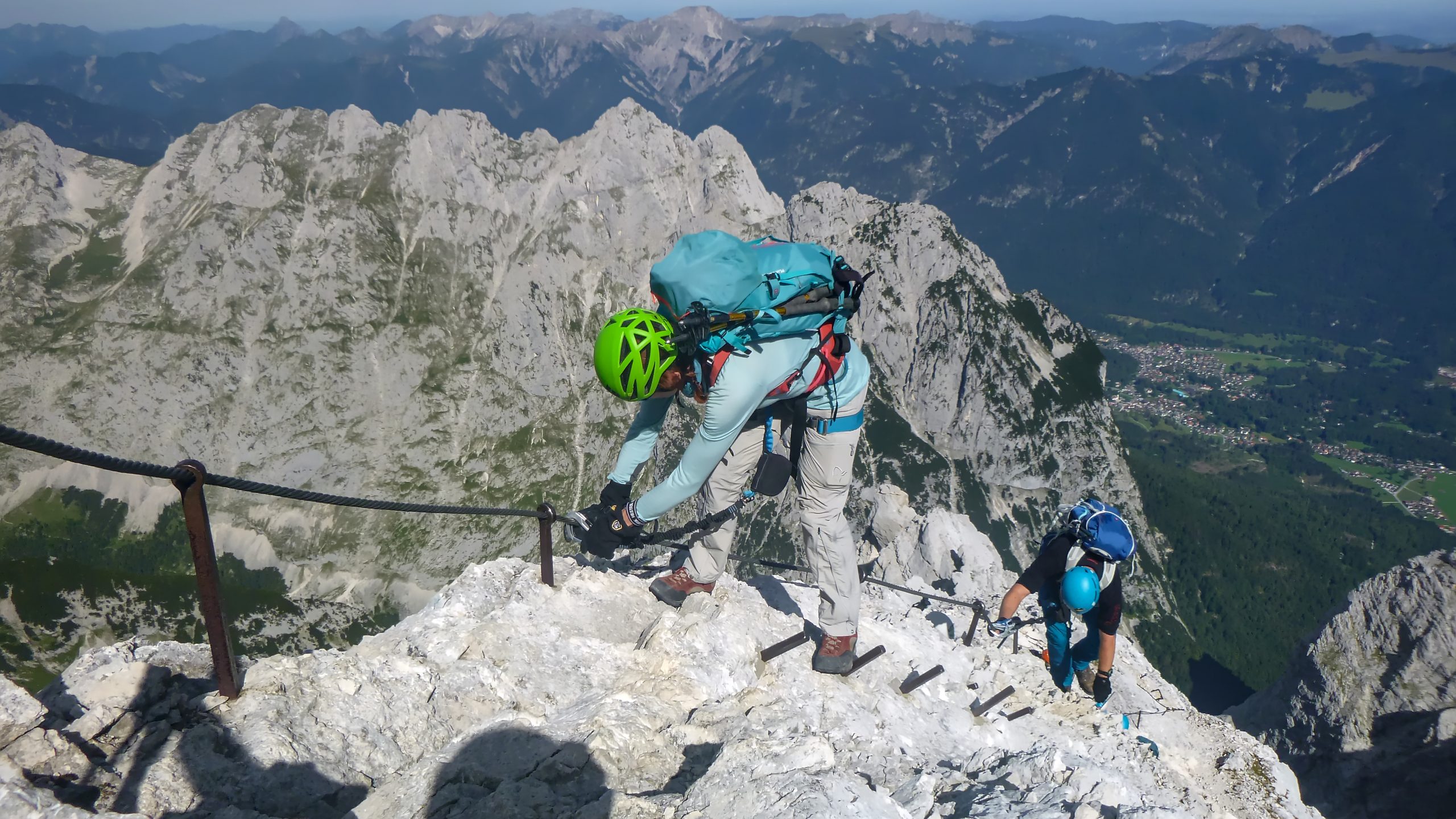 Über die durchgehende Drahtseilsicherung ging es nun immer weiter empor zur Alpspitze. Über einen Kamm kletterten wir dann leicht linksseitig in die Westflanke der Alpspitze bevor eine letzte längere Steigklammernreihe hoch zum Gipfelkreuz leitete.