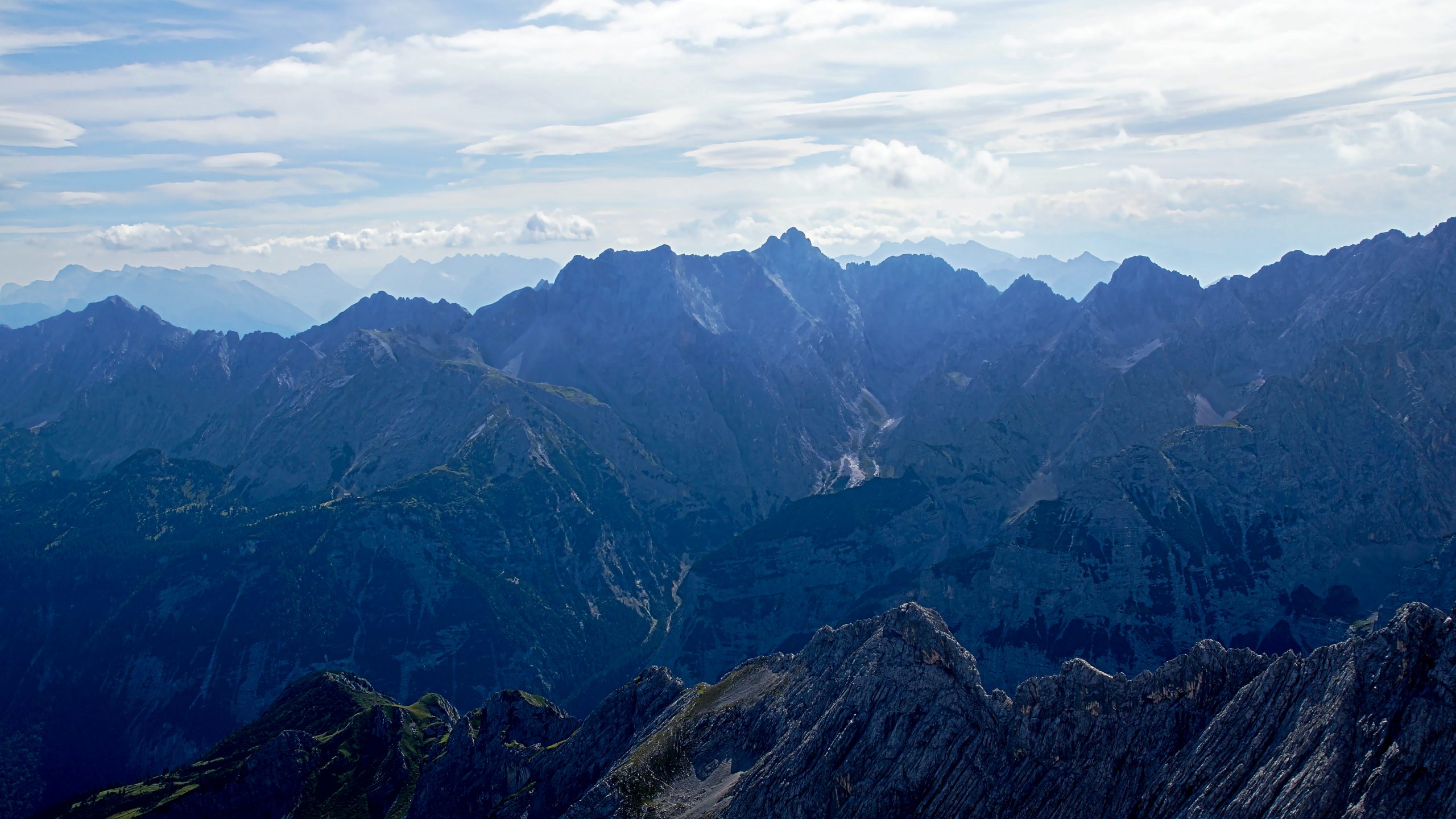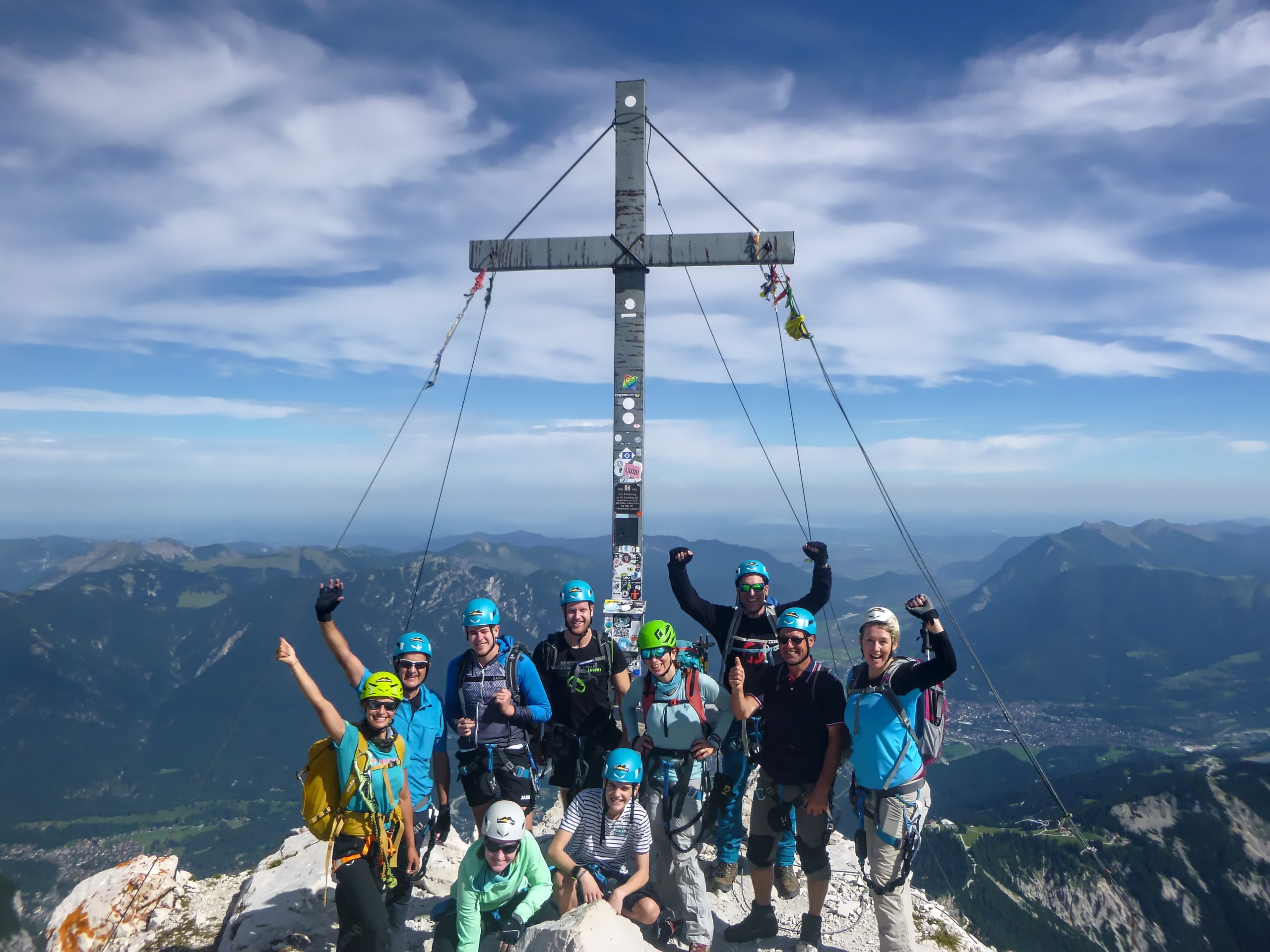 Und dann waren wir überglücklich und stolz oben am Gipfel der Alpspitze auf 2.628 Meter. Nach einem Gruppenfoto konnten wir dann die fantastische Aussicht genießen. Von hier oben hatten wir sowohl traumhafte Blicke ins Höllental und auf die Zugspitze sowie auf die gesamte Zugspitz Region mit Garmisch-Partenkirchen, die Ammergauer Alpen, das Wettersteingebirge und die Mieminger Kette.