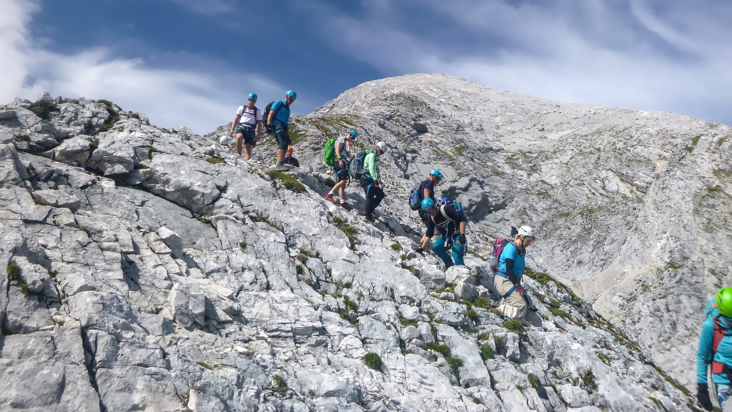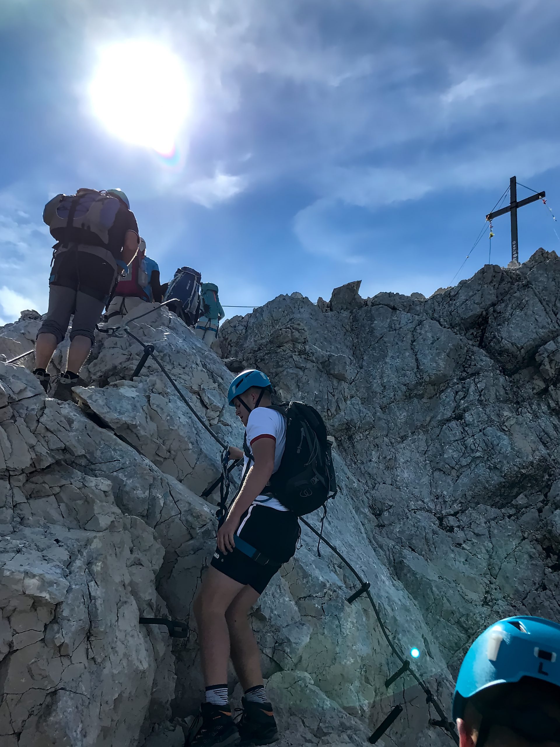 Nachdem alle den Ausblick genossen, Gipfelfotos geschossen und eine Brotzeit zu sich genommen hatten, machten wir uns mit der Gruppe an den Abstieg. Dieser führte uns über den Ostgrat Klettersteig, der zunächst ziemlich steil und ungesichert über ein langes loses Geröllfeld verlief. Das war sehr anstrengend, da man immer wieder auf dem Geröll ins Rutschen kam. Auf dem Ostgrat fing dann wieder eine teilweise mit Drahtseil gesicherte Passage an. Das hinunterklettern empfanden wir beide als viel anstrengender. Das lag vermutlich daran, dass wir einerseits natürlich schon Kraft beim Hochklettern gelassen hatten aber andererseits der Blick auch immer nach unten ging, was ich wenigstens im Kopf anstrengender empfand. Außerdem war der Abstieg lange nicht so durchgehend gesichert wir der Aufstieg.