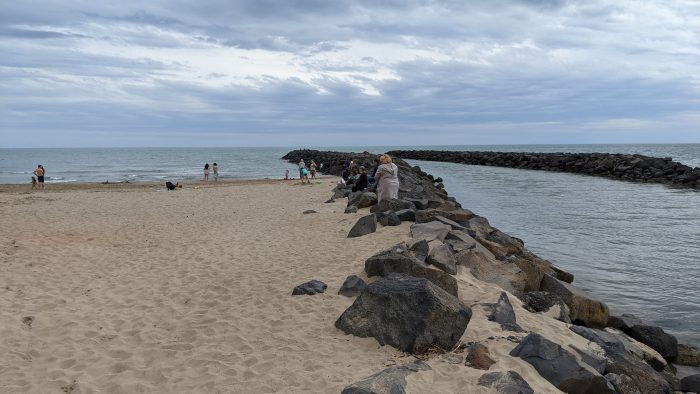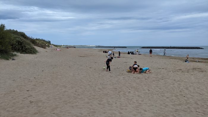 Nachdem wir uns etwas eingerichtet hatten, sind wir natürlich neugierig zum Strand gelaufen. Der ca. 5 Minuten lange Fußweg führt an einem kleinen Kanal entlang, der dann am Strand ins Meer fließt. Endlich konnten wir mal wieder ins Meer spucken. Was für ein schönes Gefühl nach einer so langen Zeit der Entbehrungen mit Lockdowns, Teil-Lockdowns, Ausgangsbeschränkungen usw..