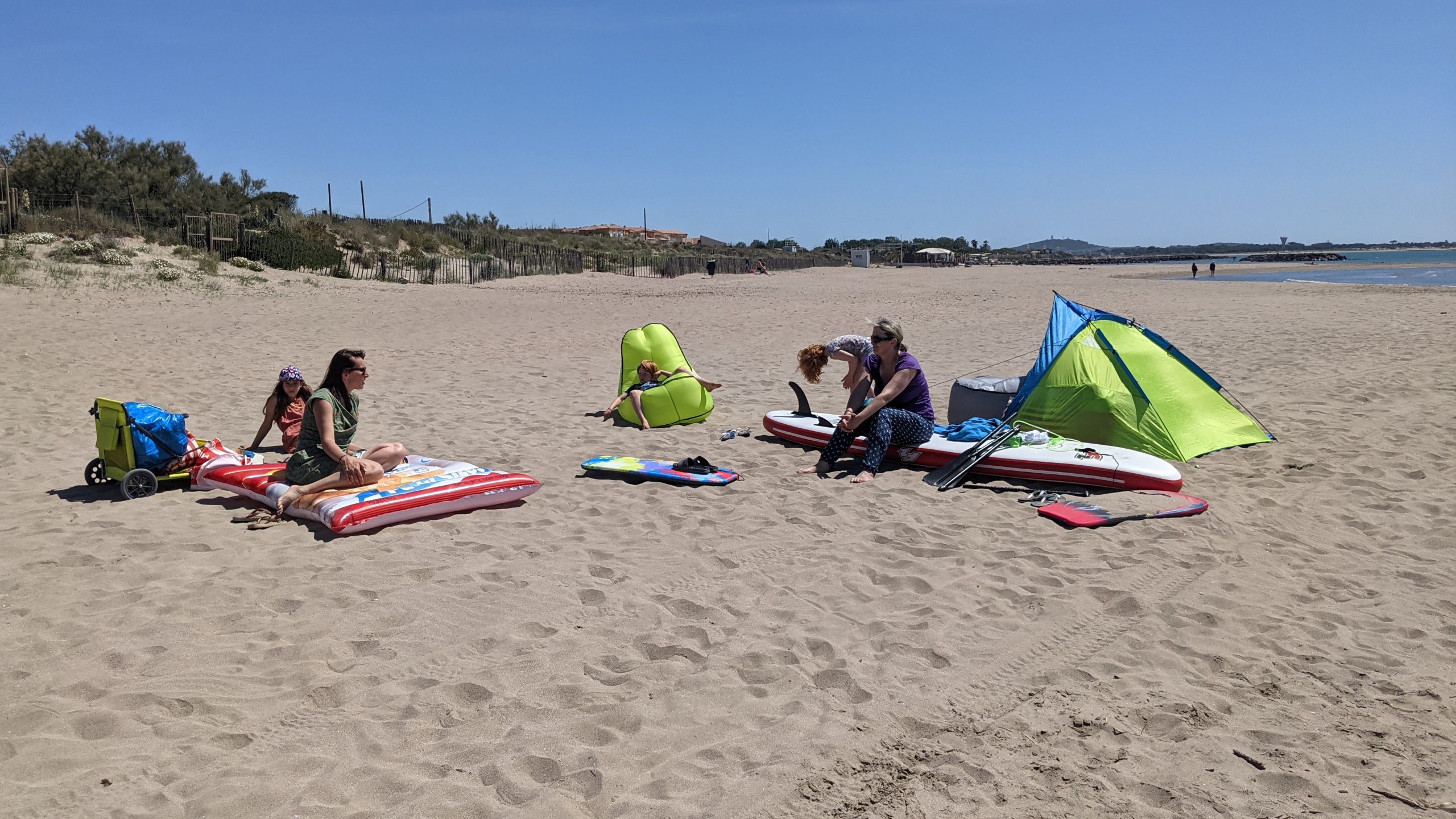Heute war so gut wie nichts los am Strand, so dass wir fast alleine an dem Strandabschnitt liegen konnten. Nachdem wir die Strandmuschel aufgebaute hatten, unseren Platz eingerichtet hatten und Ivana und Mila zu uns gestoßen waren, bin ich das erste Mal auf das SUP gegangen. Da auch die kleinen Wellen ein sicheres Stehen auf dem Brett fast unmöglich machten, habe ich das Kajakpaddel geholt und bin im Sitzen rumgefahren und dann in den kleinen Kanal reingepaddelt, der an unserem Campingplatz vorbei führt. Ich bin einmal den Kanal bis zu unserem Campingplatz hinaufgepaddelt und dann wieder zurück ins Meer gefahren. Als ich wieder am Strand war, kamen auch die restlichen Zillys und die Orlowskis dazu.