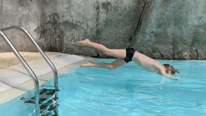 Nach dem Frühstück sind wir dann mit allen Familien zunächst an den Pool gegangen, wo die Kinder wieder mächtigen Spaß hatten. Wir haben mit den Kindern ein Wettbewerb veranstaltet. Wer kann nach einem Kopfsprung ins Wasser am weitesten gleiten? Das war wirklich lustig zu sehen mit welcher Motivation alle Kinder immer wieder ins Wasser gesprungen sind. Sogar Finn hat sich kopfüber ins Becken gestürzt.