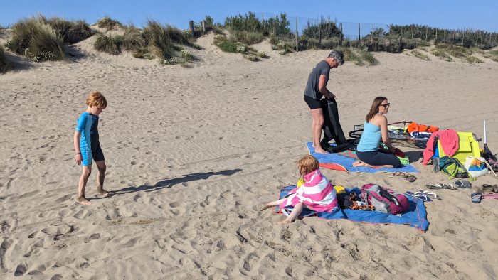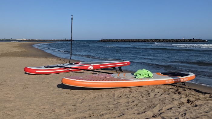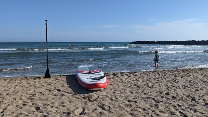 Da die Wellen heute für das Mittelmeer wirklich toll waren, wollten Markus und ich dann mit den SUPs aufs Meer und die Kinder wollten mit ihren Bodyboards in die Wellen. Also haben sich alle ihre Neoprenanzüge angezogen und es ging ab in die Wellen. Eigentlich wollte Markus heute mit den Kindern einen Windsurfausprobiernachmittag machen, aber dafür waren die Wellen zu hoch.