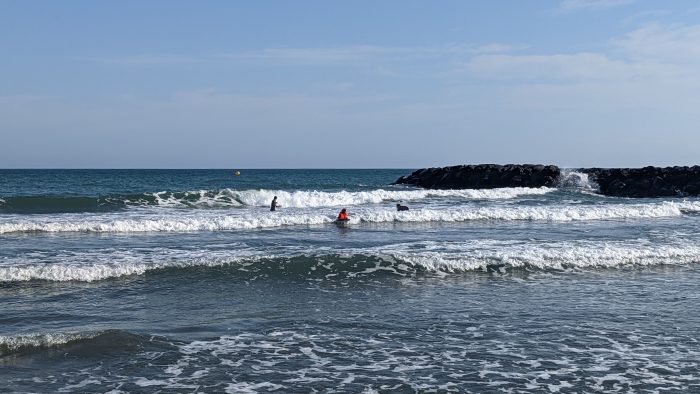 Und zum Glück war Amelie bei mir auf dem Board, denn Mila und Rosa hatten große Schwierigkeiten bei dem Wellengang und liefen Gefahr an die aufgehäuften Steinwellenbrecher gedrückt zu werden, um die wir bei der Mündung ins Meer herumfahren mussten, um an den Strand zu kommen. Ich musste die Mädchen ganz schön anschreien, damit sie alle Kräfte mobilisieren konnten, um nicht an die Steine gedrückt zu werden. Amelie hat dazu permanent gebrüllt und wollte unbedingt zurück auf das Board zu Mila und Rosa. Und vermutlich hatte sie auch etwas Angst, da sie gemerkt hatte, dass die Situation ganz schön brenzlig war.
